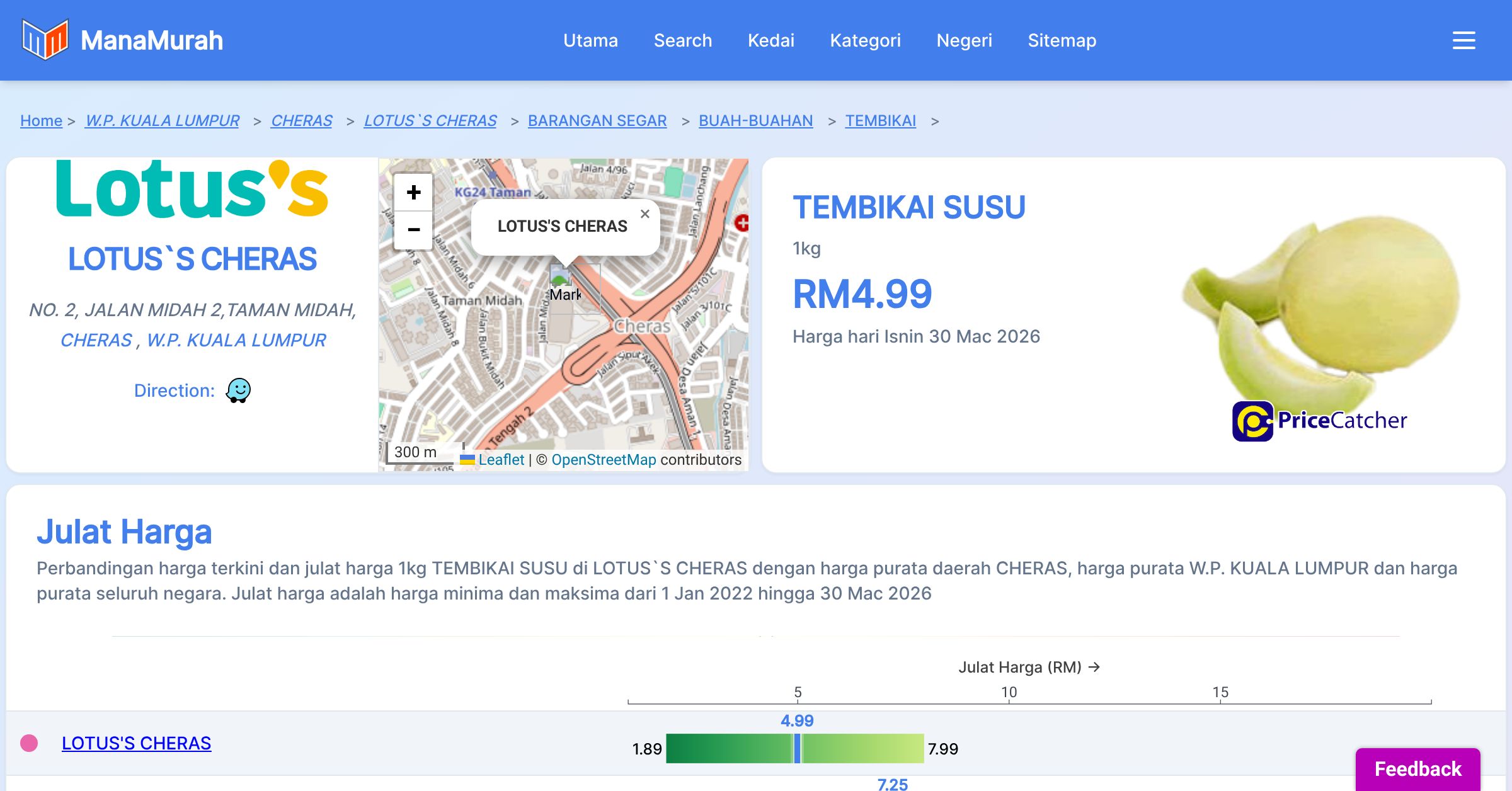 Perbandingan harga terkini dan julat harga 1kg TEMBIKAI SUSU di LOTUS`S CHERAS dengan harga purata daerah CHERAS, harga purata W.P. KUALA LUMPUR dan harga purata seluruh negara. Julat harga adalah harga minima dan maksima dari 1 Jan 2022 hingga 30 Mac 2026