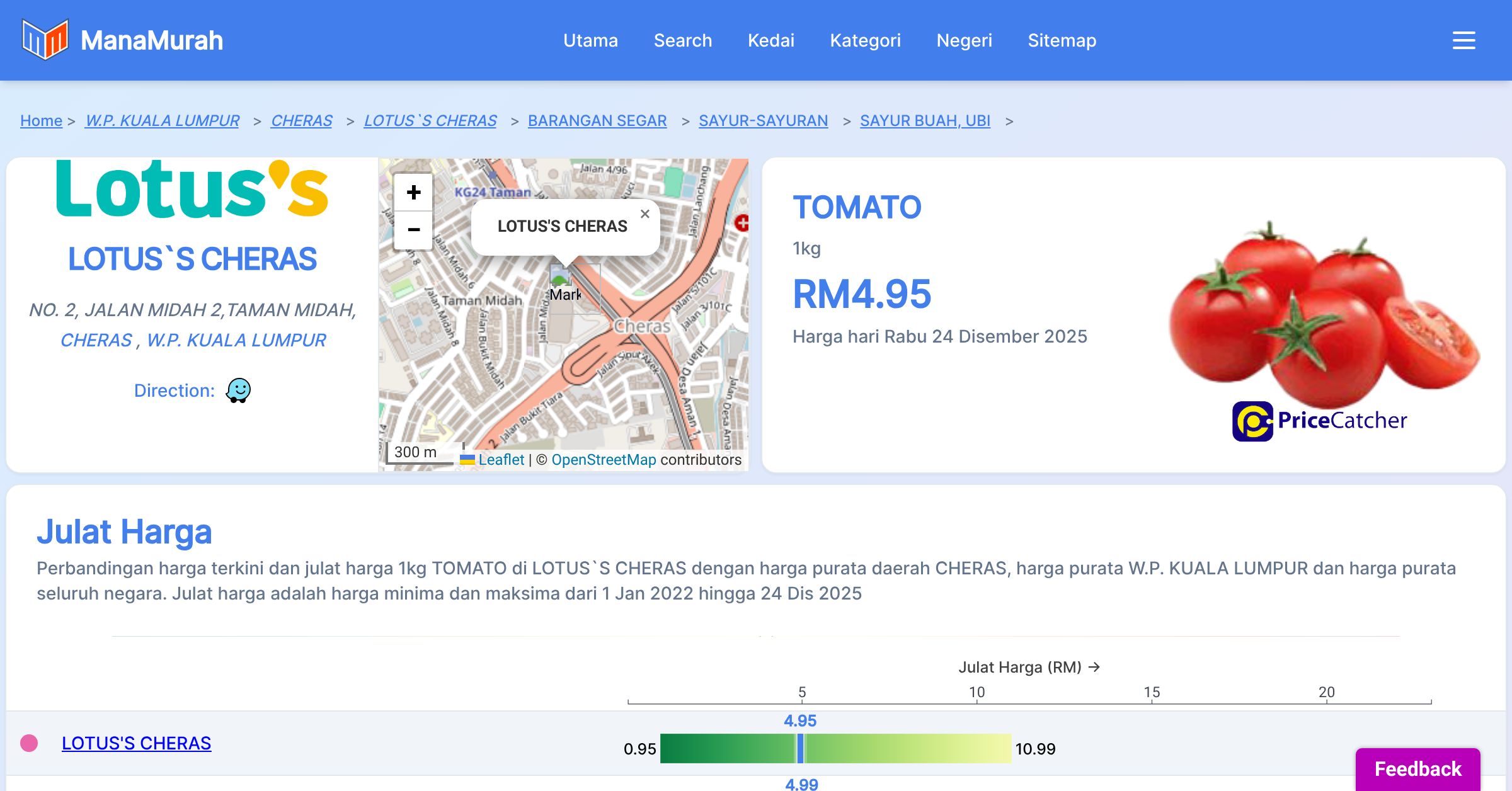 Perbandingan harga terkini dan julat harga 1kg TOMATO di LOTUS`S CHERAS dengan harga purata daerah CHERAS, harga purata W.P. KUALA LUMPUR dan harga purata seluruh negara. Julat harga adalah harga minima dan maksima dari 1 Jan 2022 hingga 24 Dis 2025