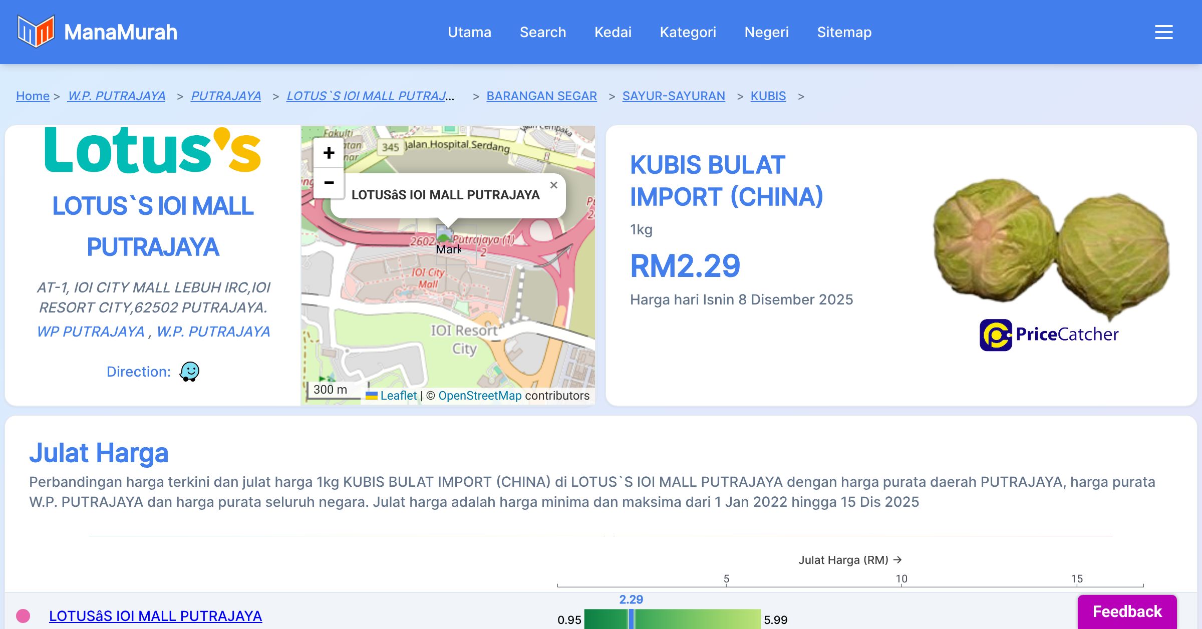 Perbandingan harga terkini dan julat harga 1kg KUBIS BULAT IMPORT (CHINA) di LOTUS`S IOI MALL PUTRAJAYA dengan harga purata daerah PUTRAJAYA, harga purata W.P. PUTRAJAYA dan harga purata seluruh negara. Julat harga adalah harga minima dan maksima dari 1 Jan 2022 hingga 14 Dis 2025