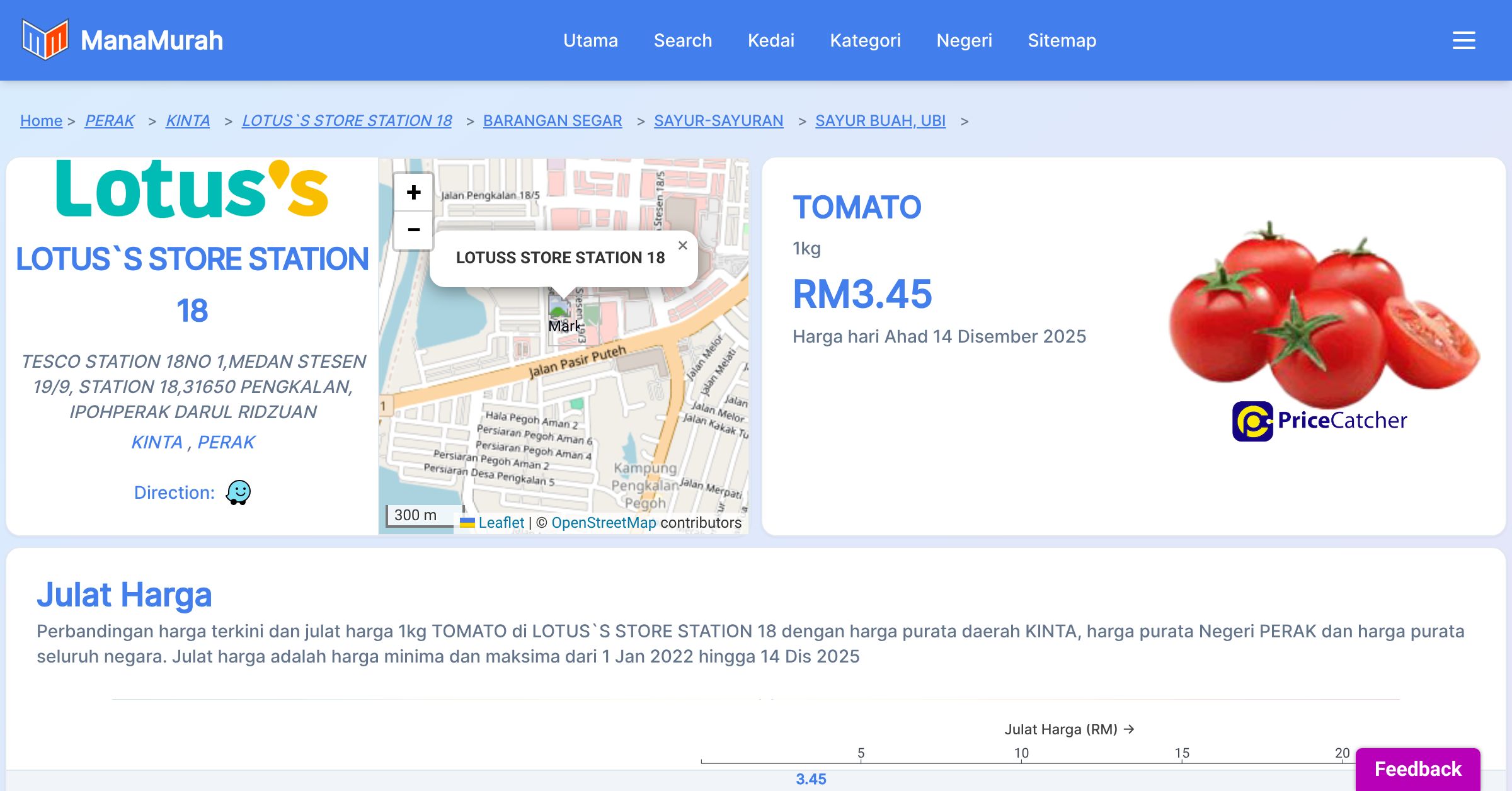 Perubahan harga purata mingguan 1kg TOMATO di LOTUSS STORE STATION 18 berbanding harga purata mingguan daerah KINTA, harga purata mingguan negeri PERAK dan harga purata mingguan seluruh negara sehingga 15 Dis 2025