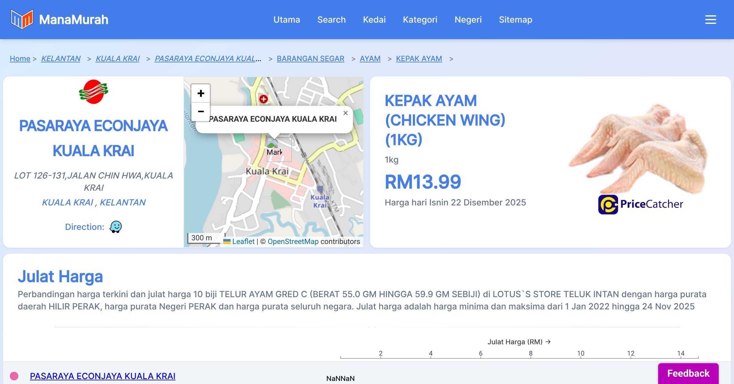 Tiada maklumat harga KEPAK AYAM (CHICKEN WING) (1KG) di Daerah KUALA KRAI pada minggu ke-52 tahun 2025 dari 22 Disember 2025