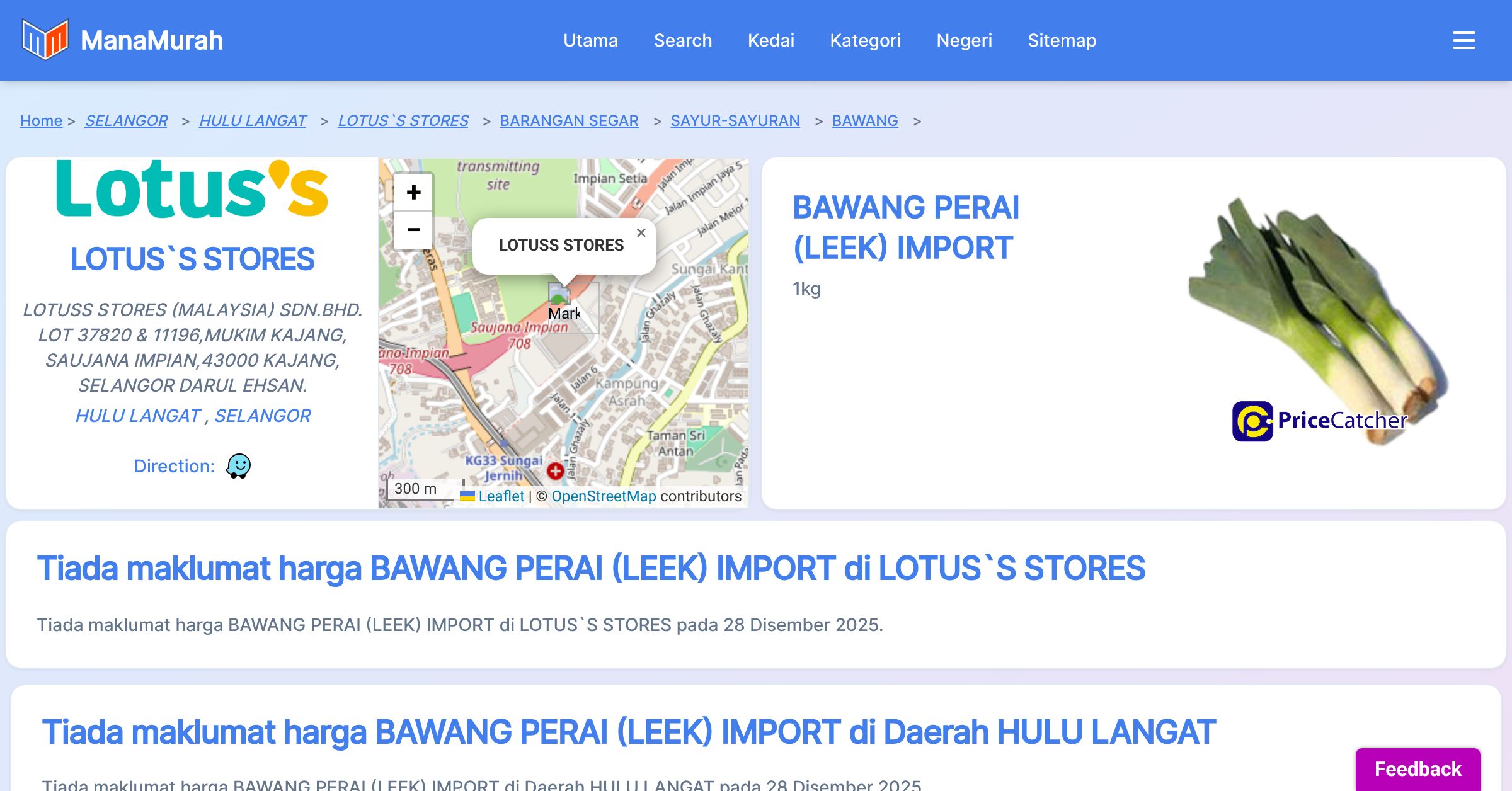 Tiada maklumat harga BAWANG PERAI (LEEK) IMPORT di LOTUS`S STORES