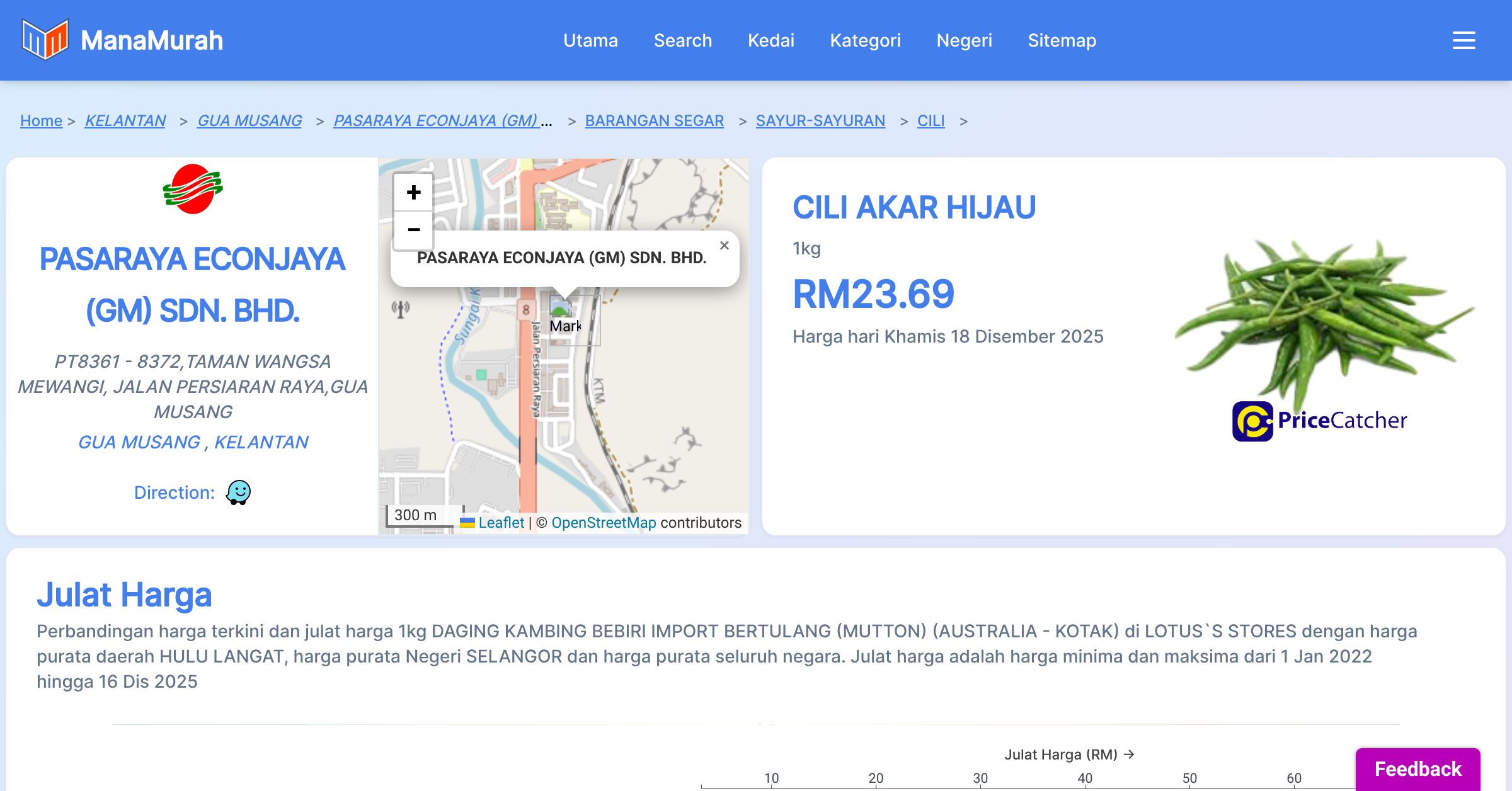 Perbandingan harga terkini dan julat harga 1kg DAGING KAMBING BEBIRI IMPORT BERTULANG (MUTTON) (AUSTRALIA - KOTAK) di LOTUS`S STORES dengan harga purata daerah HULU LANGAT, harga purata Negeri SELANGOR dan harga purata seluruh negara. Julat harga adalah harga minima dan maksima dari 1 Jan 2022 hingga 16 Dis 2025