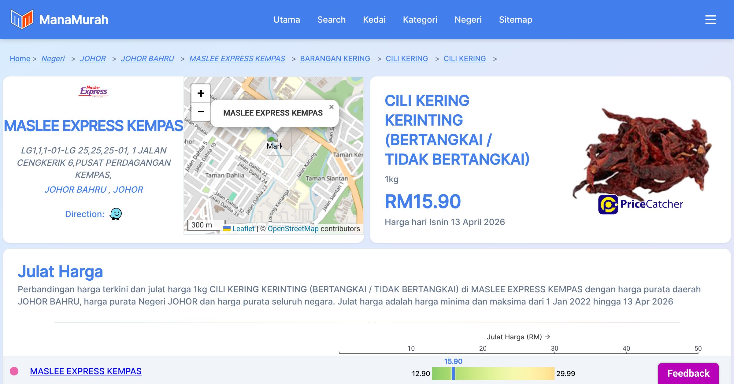 Perbandingan harga terkini dan julat harga 1kg CILI KERING KERINTING (BERTANGKAI / TIDAK BERTANGKAI) di MASLEE EXPRESS KEMPAS dengan harga purata daerah JOHOR BAHRU, harga purata Negeri JOHOR dan harga purata seluruh negara. Julat harga adalah harga minima dan maksima dari 1 Jan 2022 hingga 13 Apr 2026