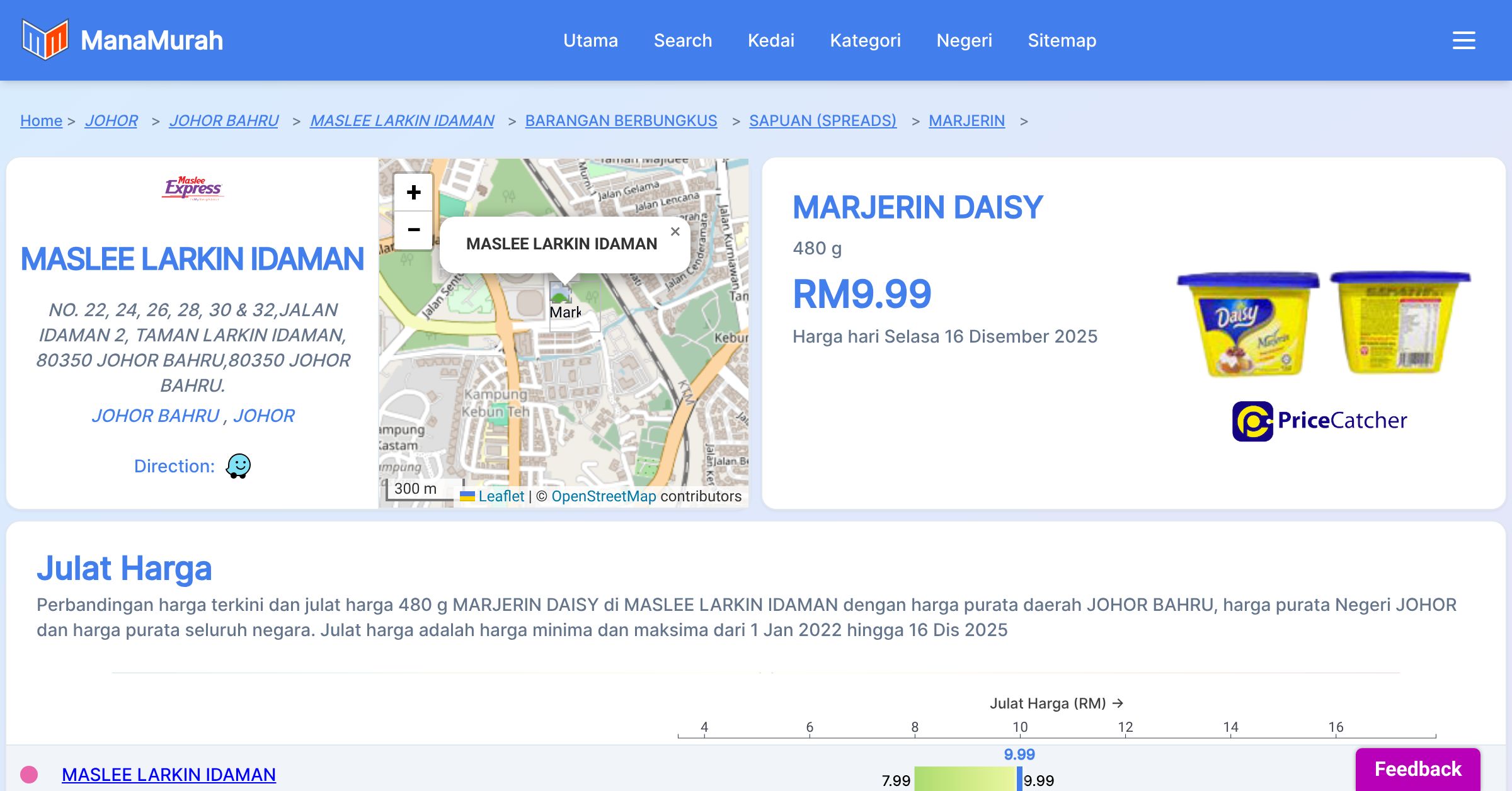 Perbandingan harga terkini dan julat harga 480 g MARJERIN DAISY di MASLEE LARKIN IDAMAN dengan harga purata daerah JOHOR BAHRU, harga purata Negeri JOHOR dan harga purata seluruh negara. Julat harga adalah harga minima dan maksima dari 1 Jan 2022 hingga 16 Dis 2025