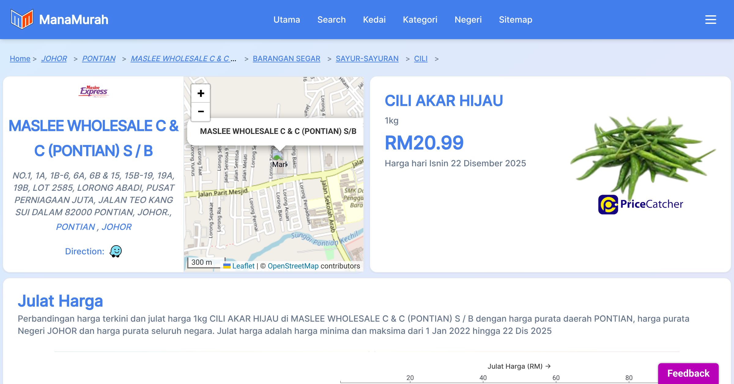Perubahan harga purata mingguan 1kg CILI AKAR HIJAU di MASLEE WHOLESALE C & C (PONTIAN) S/B berbanding harga purata mingguan daerah PONTIAN, harga purata mingguan negeri JOHOR dan harga purata mingguan seluruh negara sehingga 22 Dis 2025