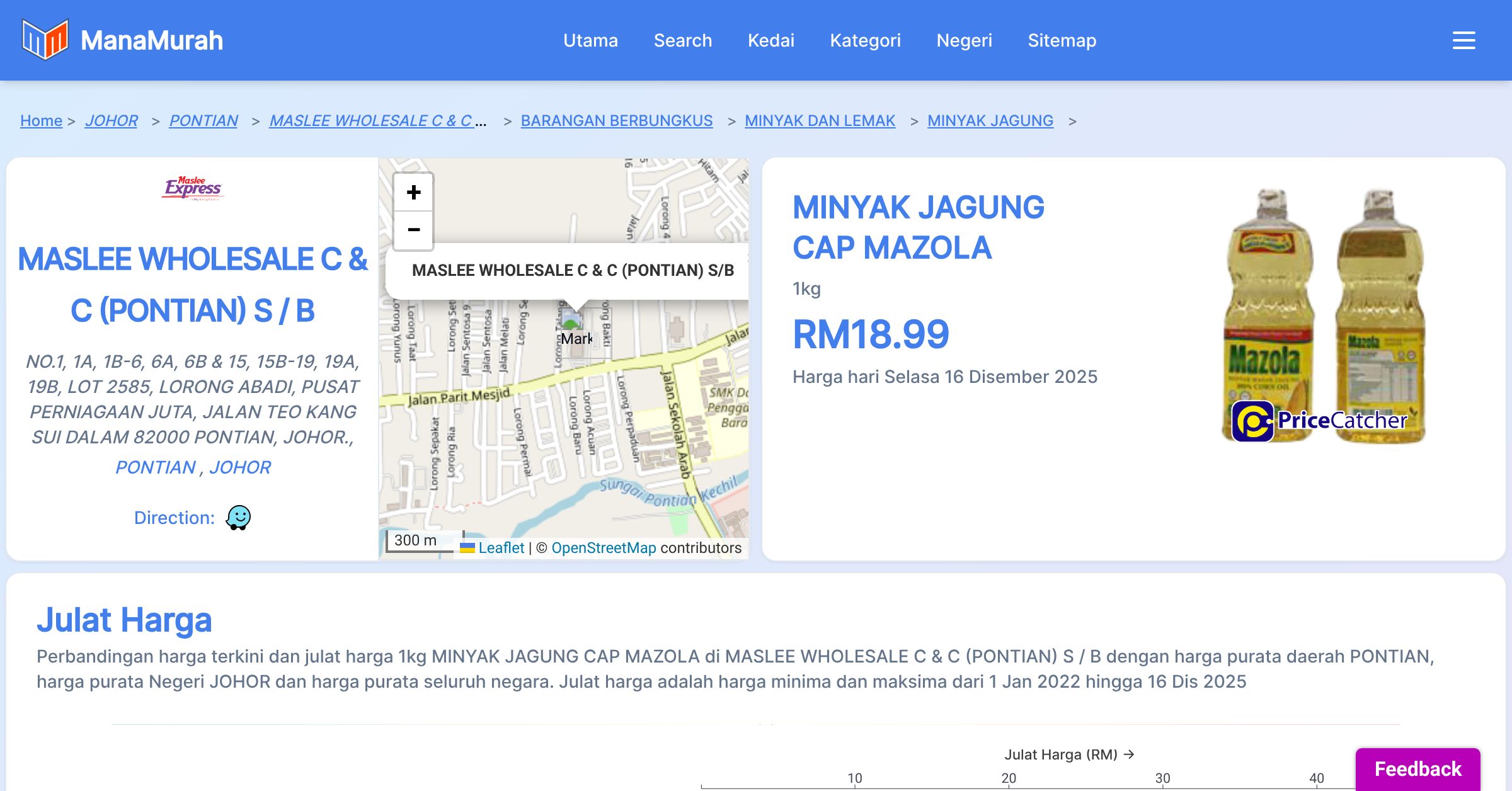 Harga purata mingguan 1kg MINYAK JAGUNG CAP MAZOLA di MASLEE WHOLESALE C & C (PONTIAN) S / B berbanding harga purata daerah PONTIAN, harga purata Negeri JOHOR dan harga purata seluruh negara