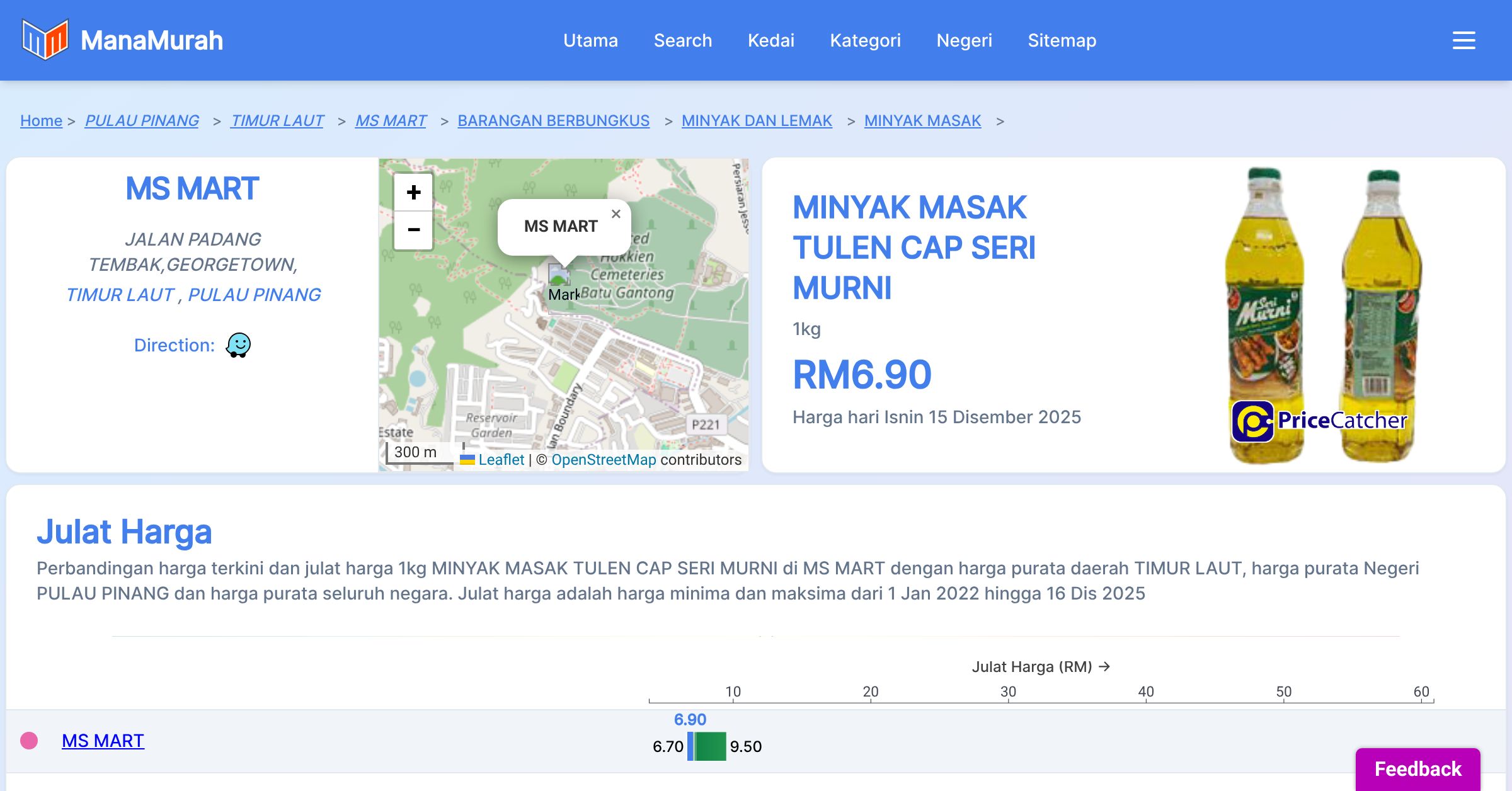 Harga purata tahunan 1kg MINYAK MASAK TULEN CAP SERI MURNI di MS MART berbanding harga purata daerah TIMUR LAUT, harga purata Negeri PULAU PINANG dan harga purata seluruh negara