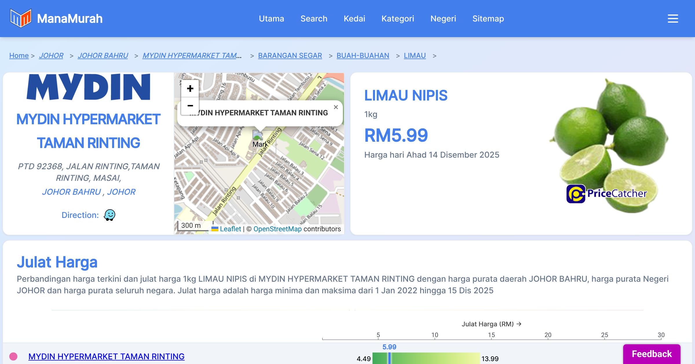 Perubahan harga purata mingguan 1kg LIMAU NIPIS di MYDIN HYPERMARKET TAMAN RINTING berbanding harga purata mingguan daerah JOHOR BAHRU, harga purata mingguan negeri JOHOR dan harga purata mingguan seluruh negara sehingga 14 Dis 2025