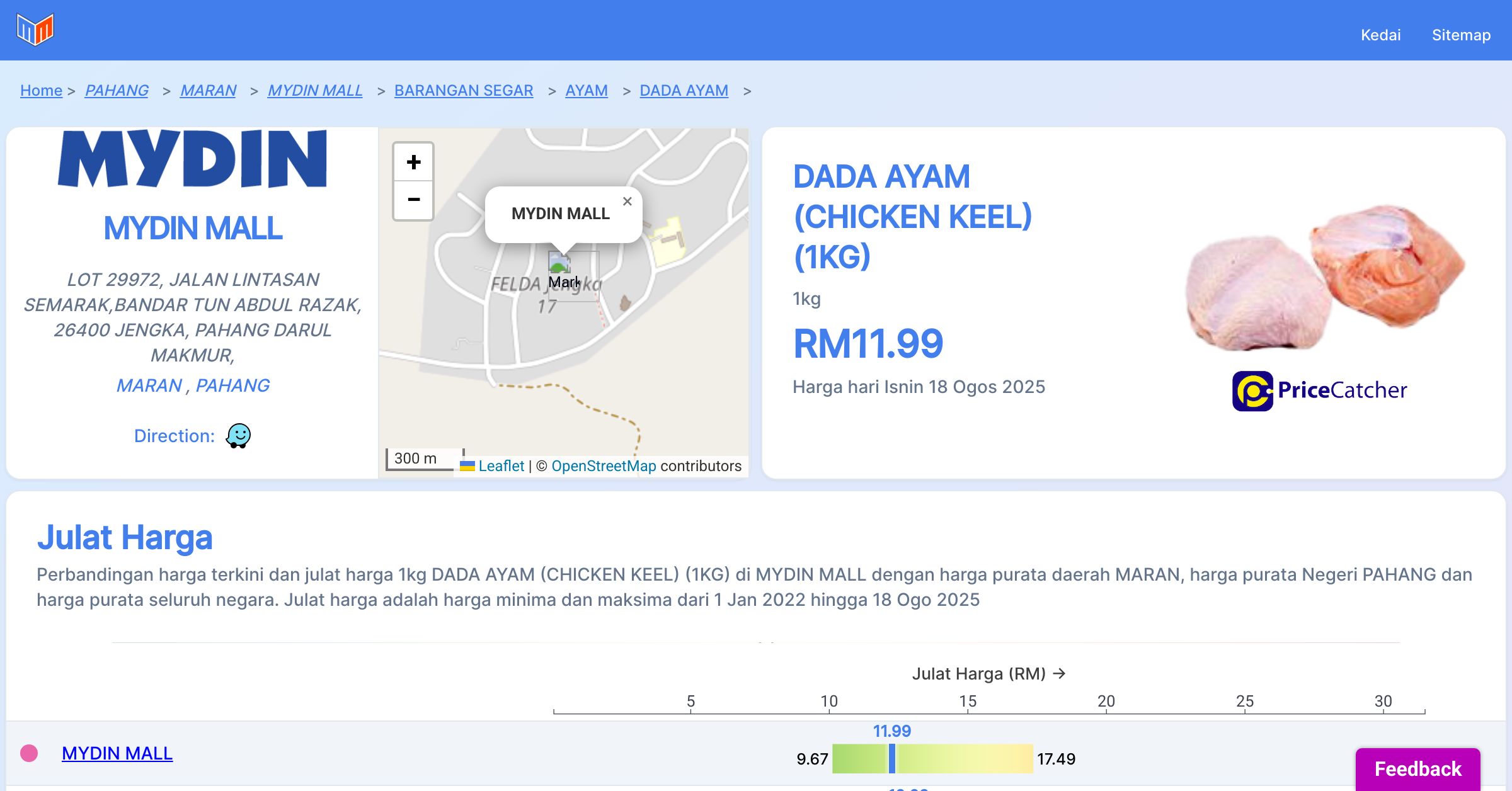 Harga purata bulanan 1kg DADA AYAM (CHICKEN KEEL) (1KG) di MYDIN MALL berbanding harga purata daerah MARAN, harga purata Negeri PAHANG dan harga purata seluruh negara