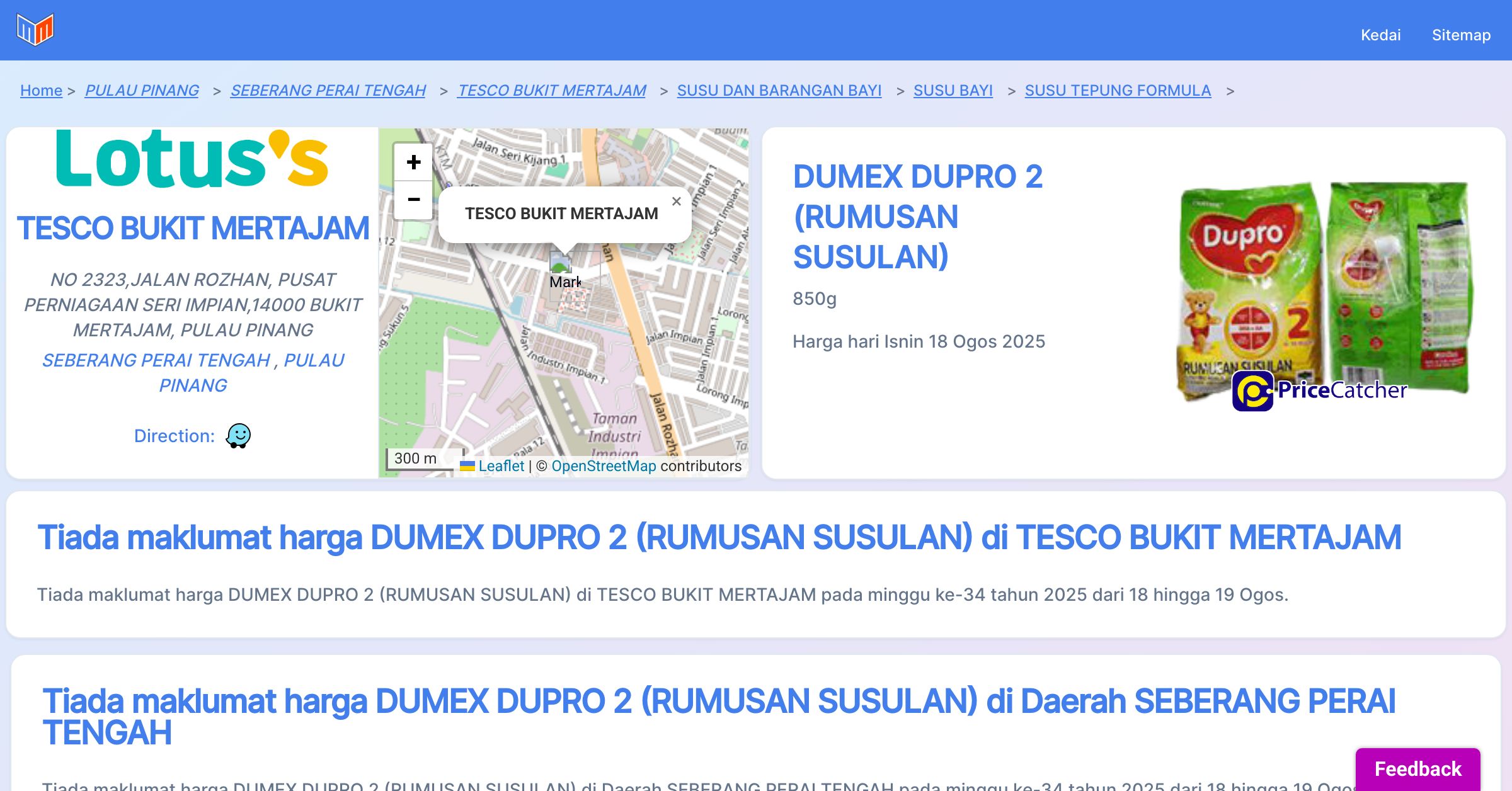 Harga purata mingguan 1kg MILO (PAKET) di MYDIN MALL berbanding harga purata daerah MARAN, harga purata Negeri PAHANG dan harga purata seluruh negara