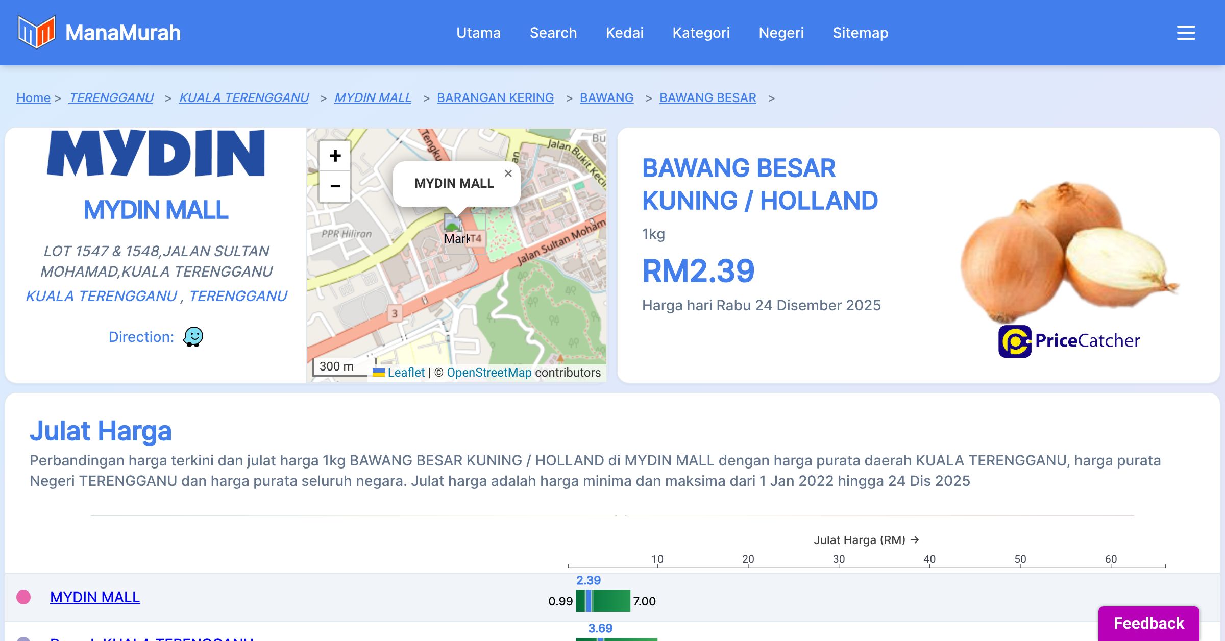 Harga purata tahunan 1kg BAWANG BESAR KUNING / HOLLAND di MYDIN MALL berbanding harga purata daerah KUALA TERENGGANU, harga purata Negeri TERENGGANU dan harga purata seluruh negara