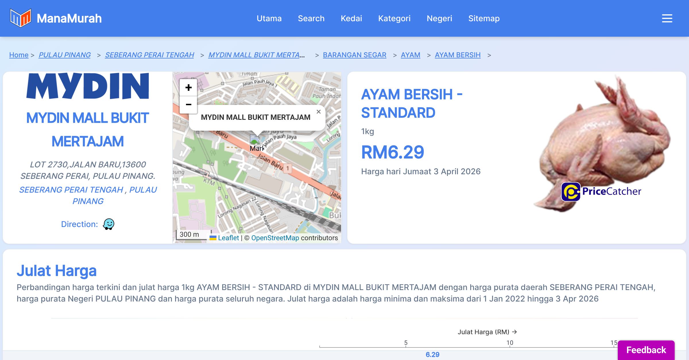 Perbandingan harga terkini dan julat harga 1kg AYAM BERSIH - STANDARD di MYDIN MALL BUKIT MERTAJAM dengan harga purata daerah SEBERANG PERAI TENGAH, harga purata Negeri PULAU PINANG dan harga purata seluruh negara. Julat harga adalah harga minima dan maksima dari 1 Jan 2022 hingga 3 Apr 2026