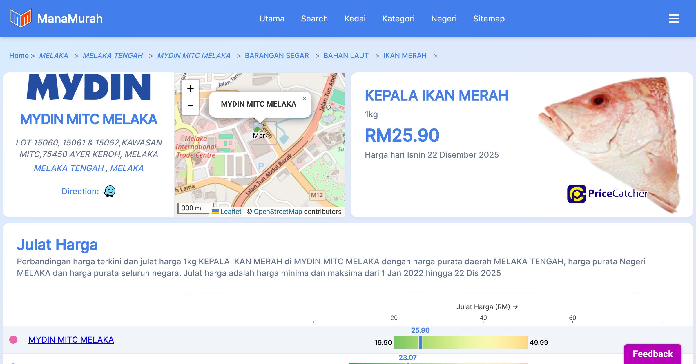 Perbandingan harga terkini dan julat harga 1kg KEPALA IKAN MERAH di MYDIN MITC MELAKA dengan harga purata daerah MELAKA TENGAH, harga purata Negeri MELAKA dan harga purata seluruh negara. Julat harga adalah harga minima dan maksima dari 1 Jan 2022 hingga 22 Dis 2025