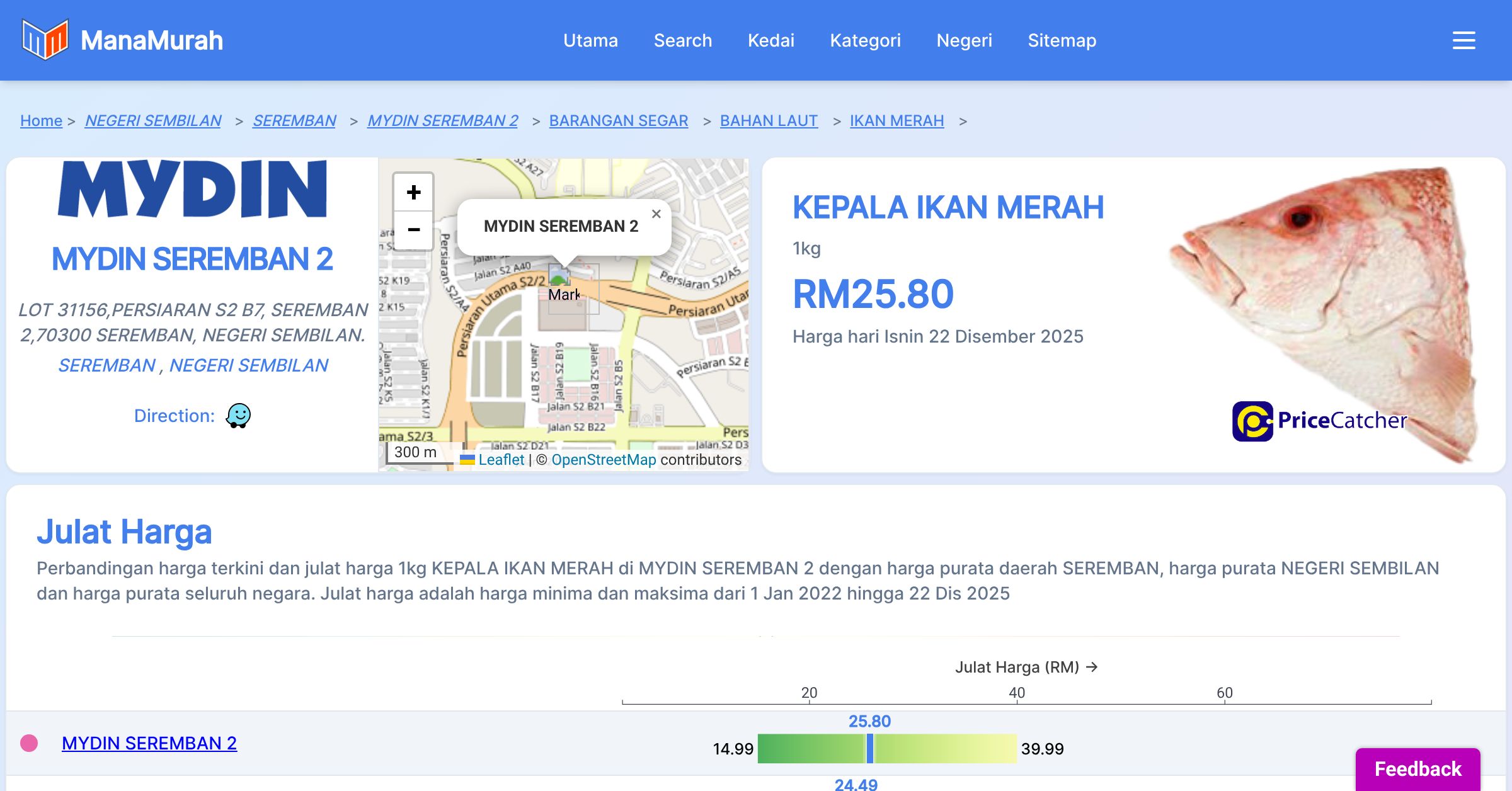 Perbandingan harga terkini dan julat harga 1kg KEPALA IKAN MERAH di MYDIN SEREMBAN 2 dengan harga purata daerah SEREMBAN, harga purata NEGERI SEMBILAN dan harga purata seluruh negara. Julat harga adalah harga minima dan maksima dari 1 Jan 2022 hingga 22 Dis 2025