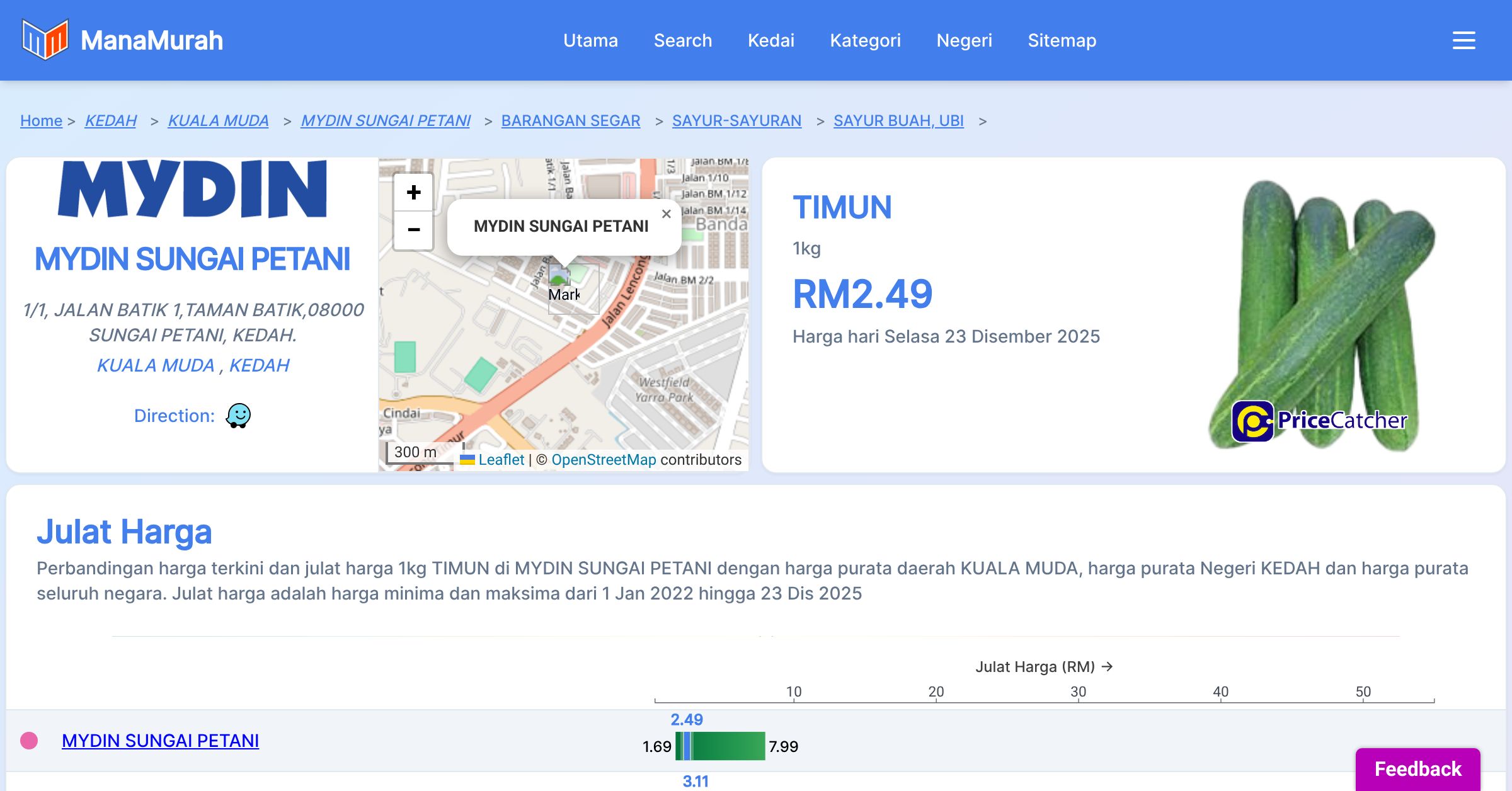 Perbandingan harga terkini dan julat harga 1kg TIMUN di MYDIN SUNGAI PETANI dengan harga purata daerah KUALA MUDA, harga purata Negeri KEDAH dan harga purata seluruh negara. Julat harga adalah harga minima dan maksima dari 1 Jan 2022 hingga 6 Apr 2026