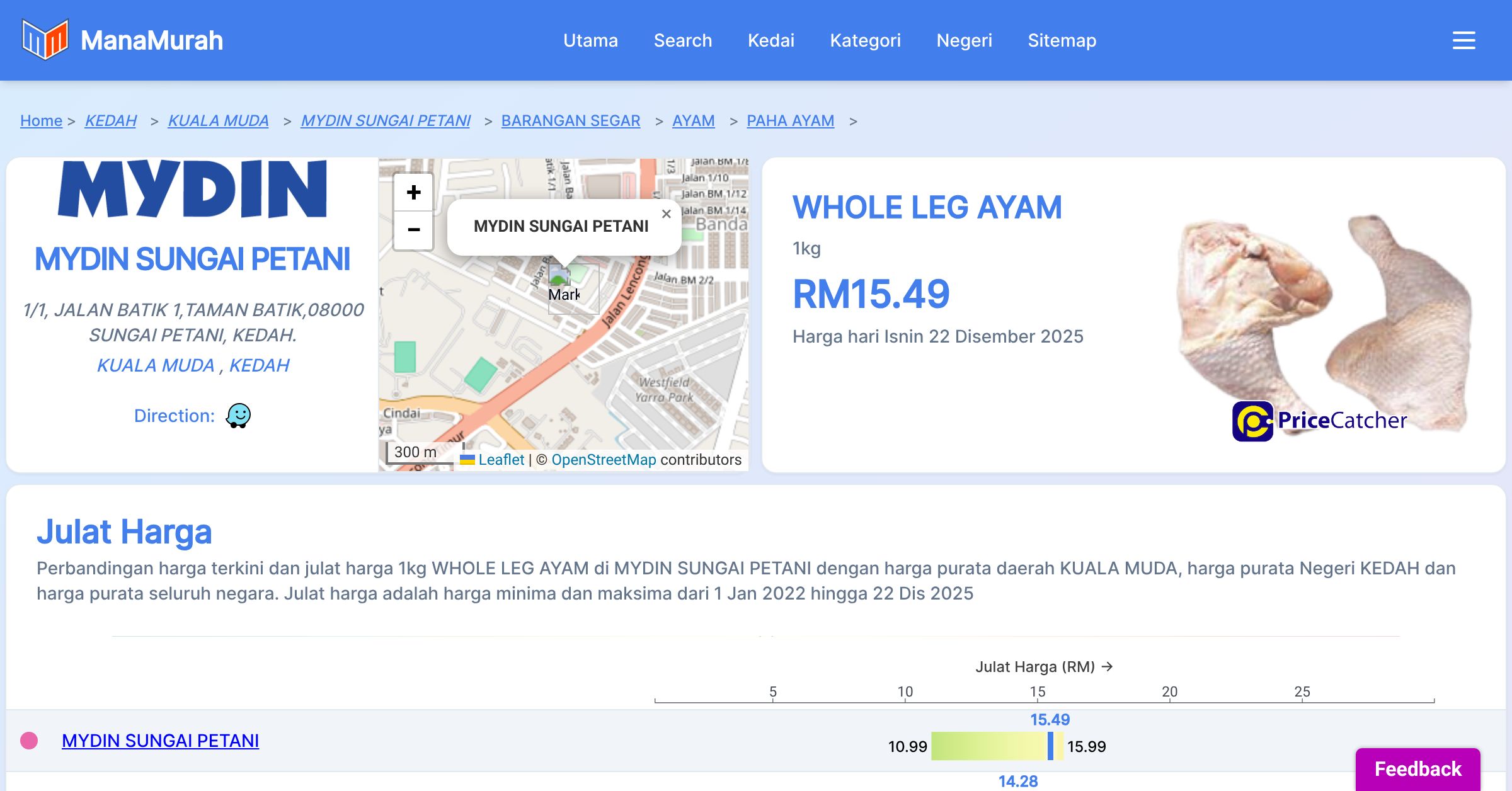 Perubahan harga purata mingguan 1kg WHOLE LEG AYAM di MYDIN SUNGAI PETANI berbanding harga purata mingguan daerah KUALA MUDA, harga purata mingguan negeri KEDAH dan harga purata mingguan seluruh negara sehingga 22 Dis 2025