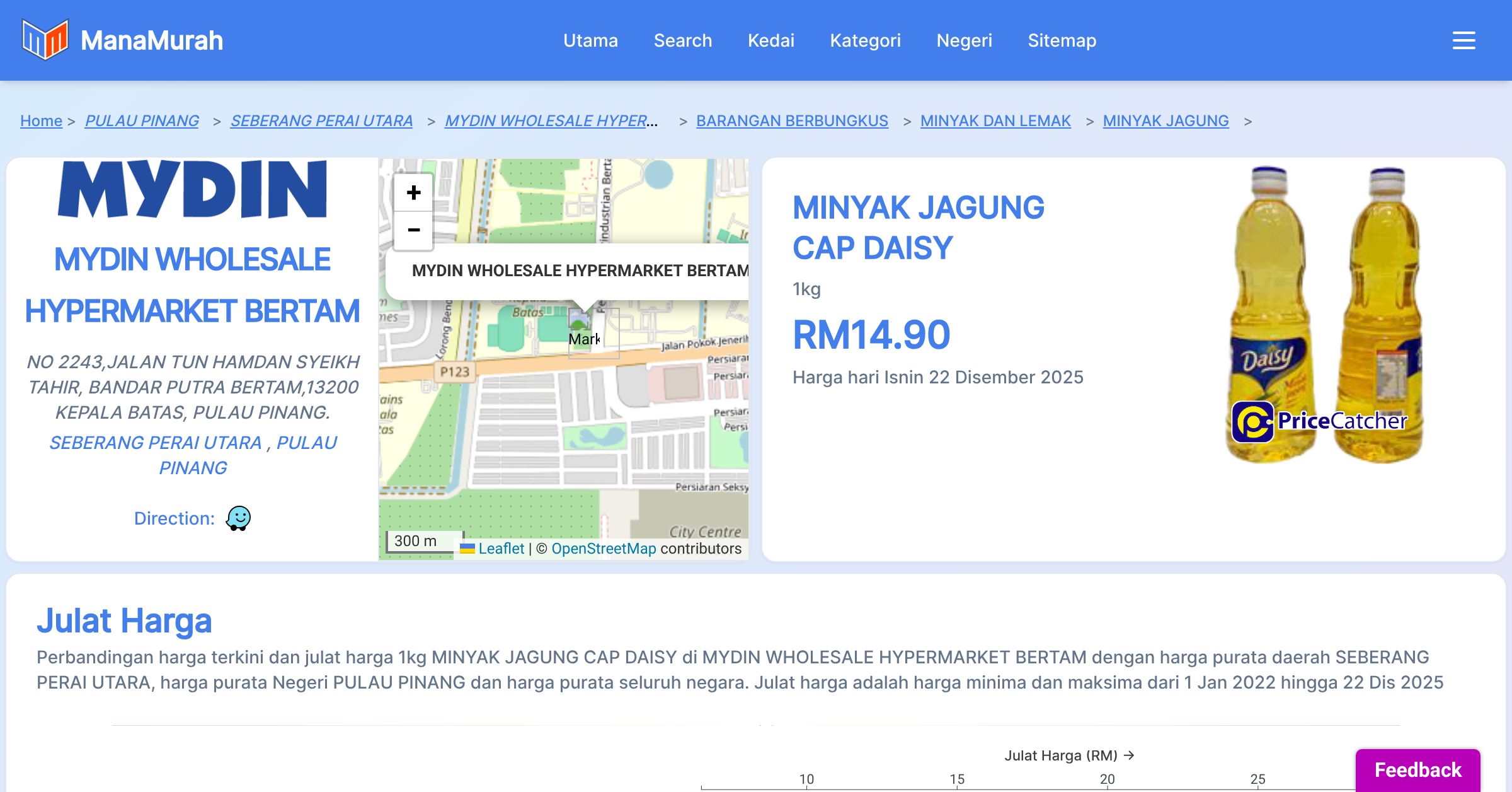 Perubahan harga purata mingguan 1kg MINYAK JAGUNG CAP DAISY di MYDIN WHOLESALE HYPERMARKET BERTAM berbanding harga purata mingguan daerah SEBERANG PERAI UTARA, harga purata mingguan negeri PULAU PINANG dan harga purata mingguan seluruh negara sehingga 22 Dis 2025
