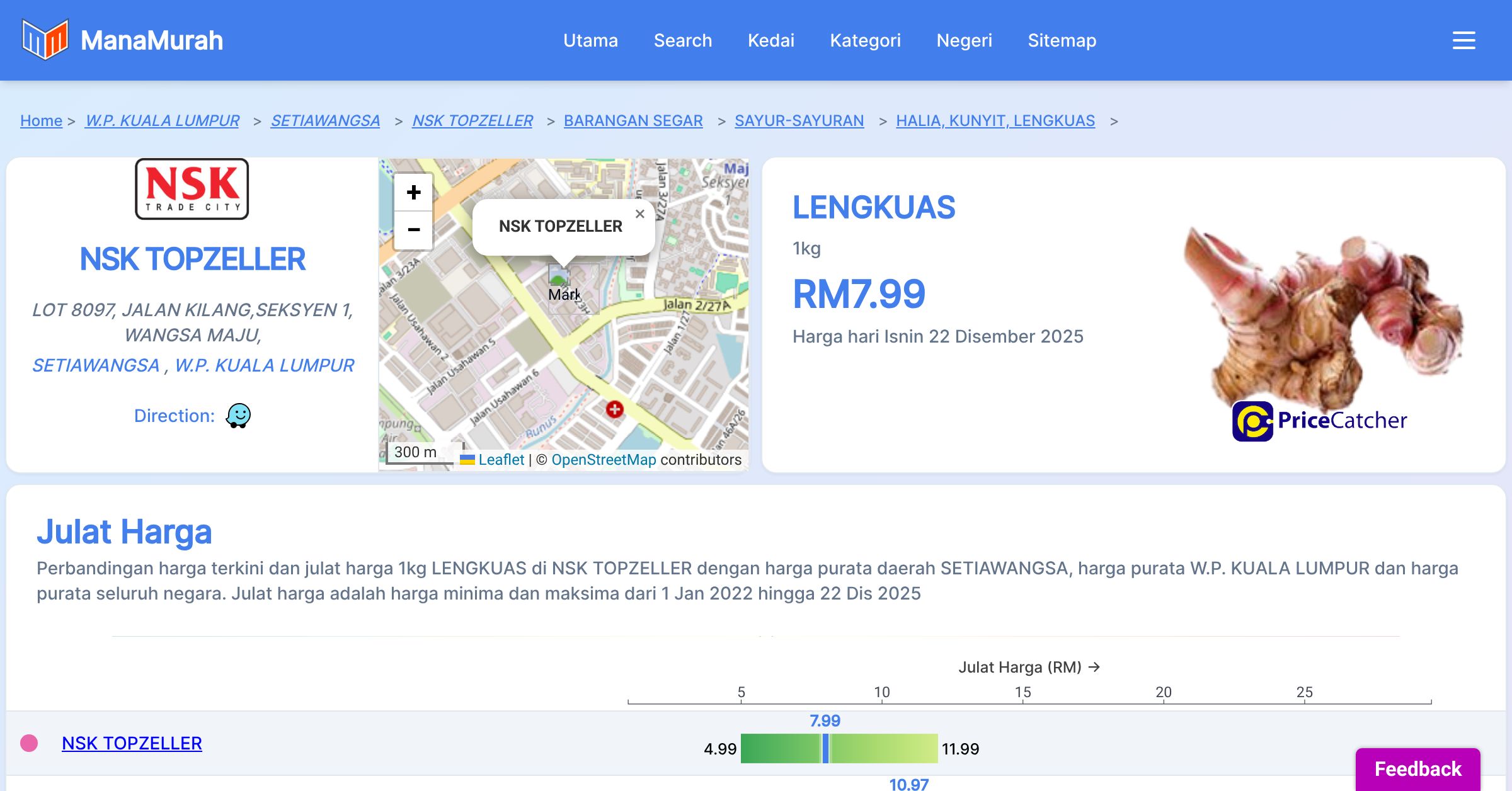 Perubahan harga purata mingguan 1kg LENGKUAS di NSK TOPZELLER berbanding harga purata mingguan daerah SETIAWANGSA, harga purata mingguan negeri W.P. KUALA LUMPUR dan harga purata mingguan seluruh negara sehingga 22 Dis 2025