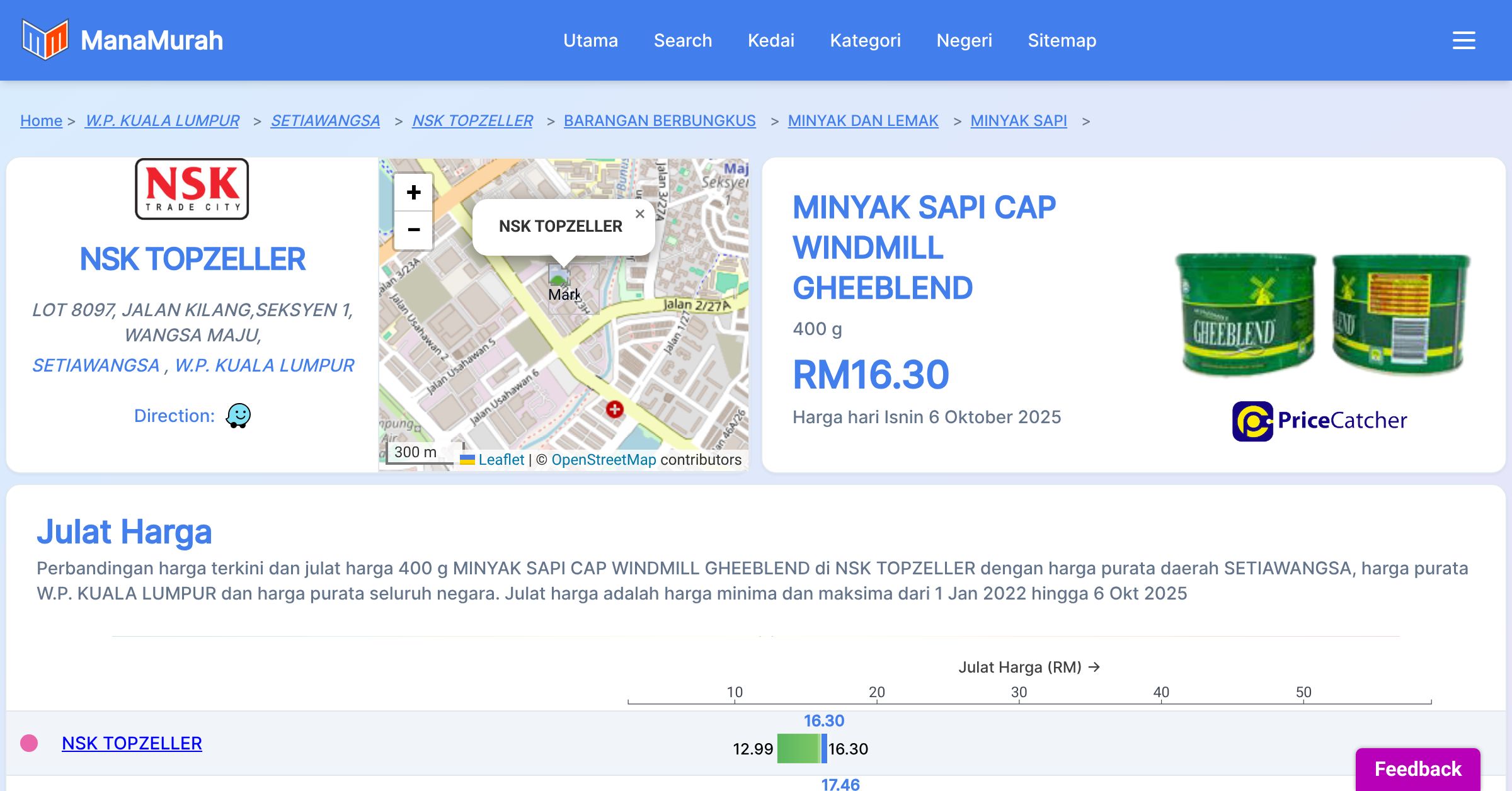 Perubahan harga purata mingguan 400 g MINYAK SAPI CAP WINDMILL GHEEBLEND di NSK TOPZELLER berbanding harga purata mingguan daerah SETIAWANGSA, harga purata mingguan negeri W.P. KUALA LUMPUR dan harga purata mingguan seluruh negara sehingga 6 Okt 2025
