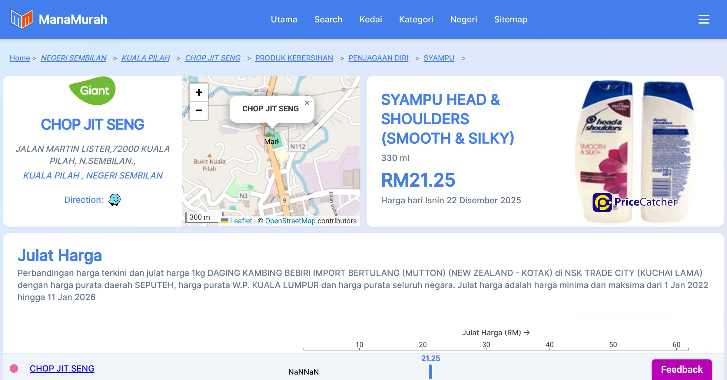 Perbandingan harga terkini dan julat harga 1kg DAGING KAMBING BEBIRI IMPORT BERTULANG (MUTTON) (NEW ZEALAND - KOTAK) di NSK TRADE CITY (KUCHAI LAMA) dengan harga purata daerah SEPUTEH, harga purata W.P. KUALA LUMPUR dan harga purata seluruh negara. Julat harga adalah harga minima dan maksima dari 1 Jan 2022 hingga 5 Jan 2026
