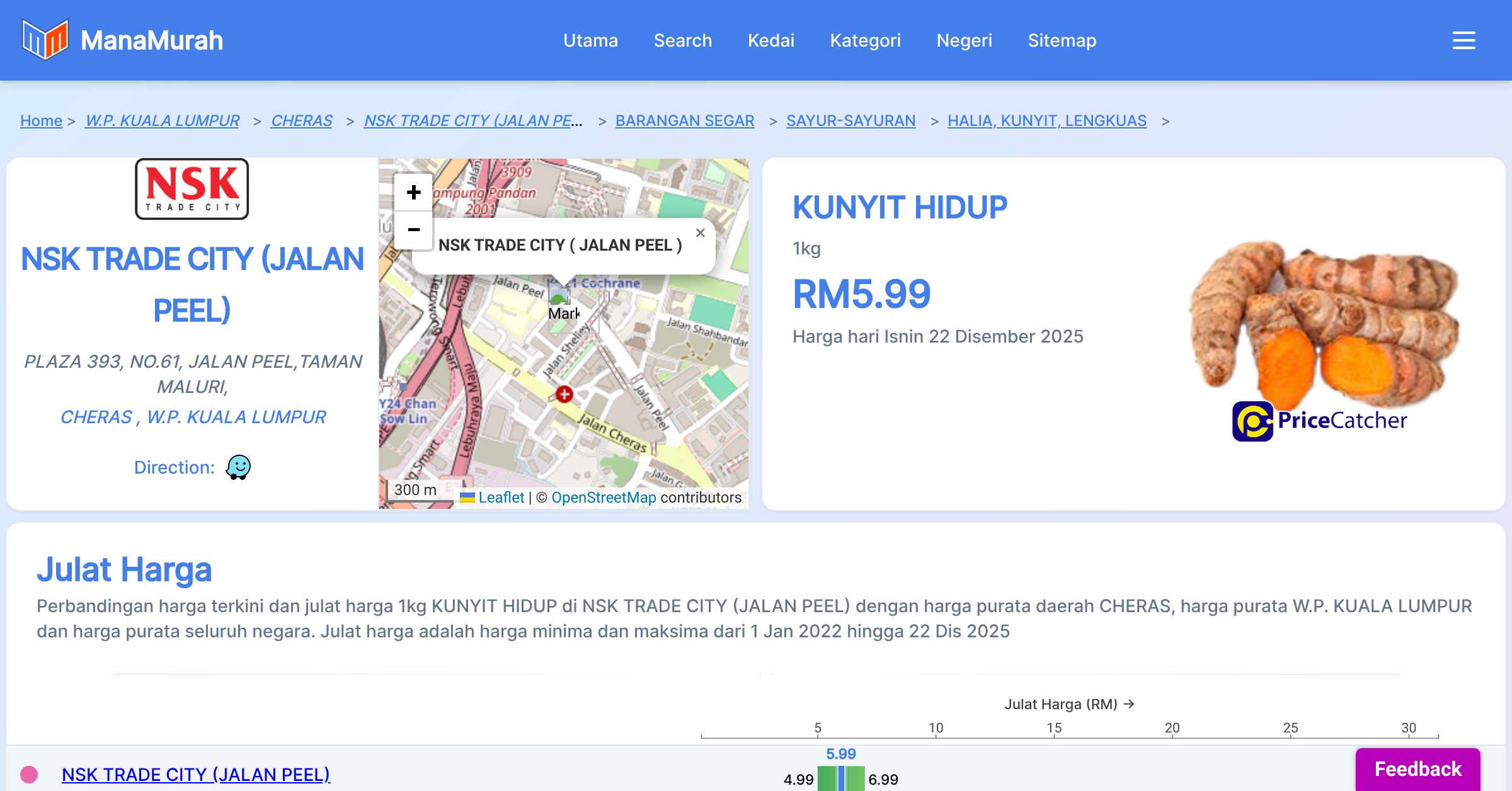 Perubahan harga purata mingguan 1kg KUNYIT HIDUP di NSK TRADE CITY ( JALAN PEEL ) berbanding harga purata mingguan daerah CHERAS, harga purata mingguan negeri W.P. KUALA LUMPUR dan harga purata mingguan seluruh negara sehingga 22 Dis 2025