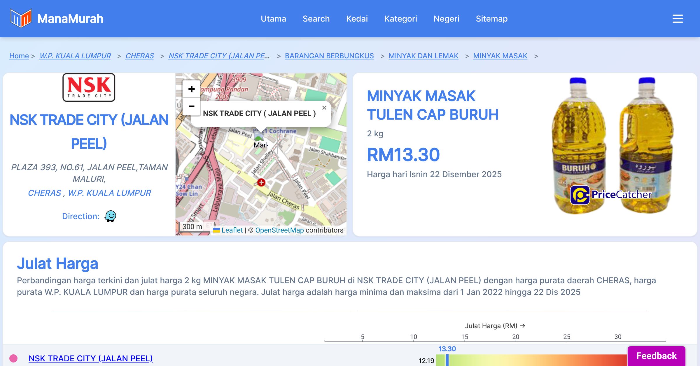 Perbandingan harga terkini dan julat harga 2 kg MINYAK MASAK TULEN CAP BURUH di NSK TRADE CITY (JALAN PEEL) dengan harga purata daerah CHERAS, harga purata W.P. KUALA LUMPUR dan harga purata seluruh negara. Julat harga adalah harga minima dan maksima dari 1 Jan 2022 hingga 22 Dis 2025