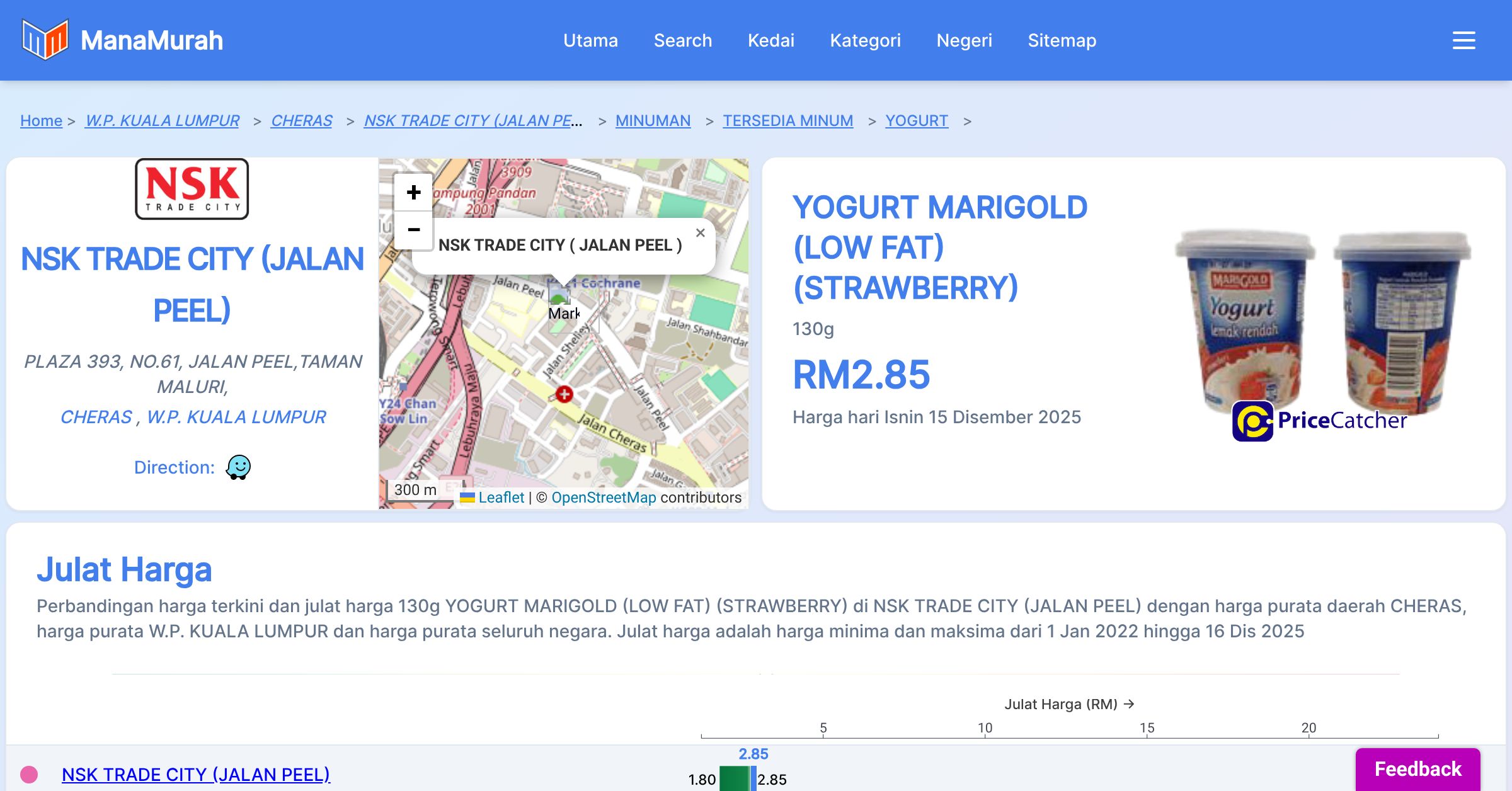 Perubahan harga purata mingguan 130g YOGURT MARIGOLD (LOW FAT) (STRAWBERRY) di NSK TRADE CITY ( JALAN PEEL ) berbanding harga purata mingguan daerah CHERAS, harga purata mingguan negeri W.P. KUALA LUMPUR dan harga purata mingguan seluruh negara sehingga 15 Dis 2025