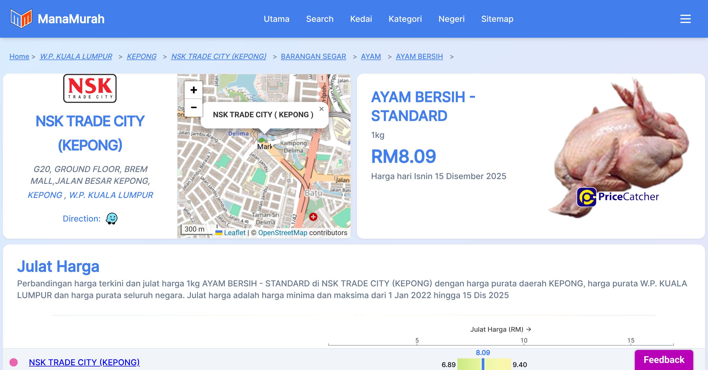 Perbandingan harga terkini dan julat harga 1kg AYAM BERSIH - STANDARD di NSK TRADE CITY (KEPONG) dengan harga purata daerah KEPONG, harga purata W.P. KUALA LUMPUR dan harga purata seluruh negara. Julat harga adalah harga minima dan maksima dari 1 Jan 2022 hingga 14 Dis 2025