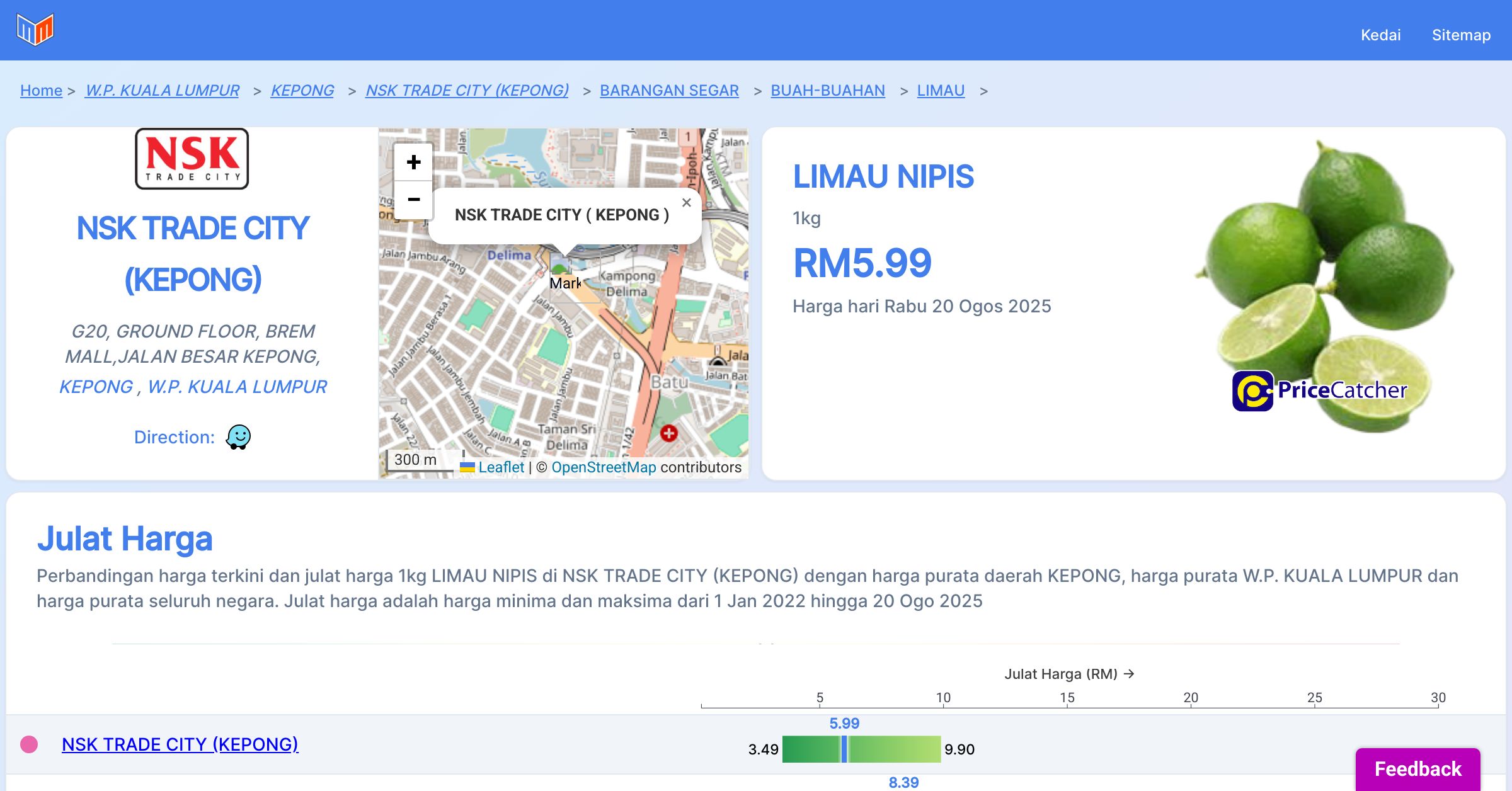 Perbandingan harga terkini dan julat harga 1kg LIMAU NIPIS di NSK TRADE CITY (KEPONG) dengan harga purata daerah KEPONG, harga purata W.P. KUALA LUMPUR dan harga purata seluruh negara. Julat harga adalah harga minima dan maksima dari 1 Jan 2022 hingga 24 Dis 2025