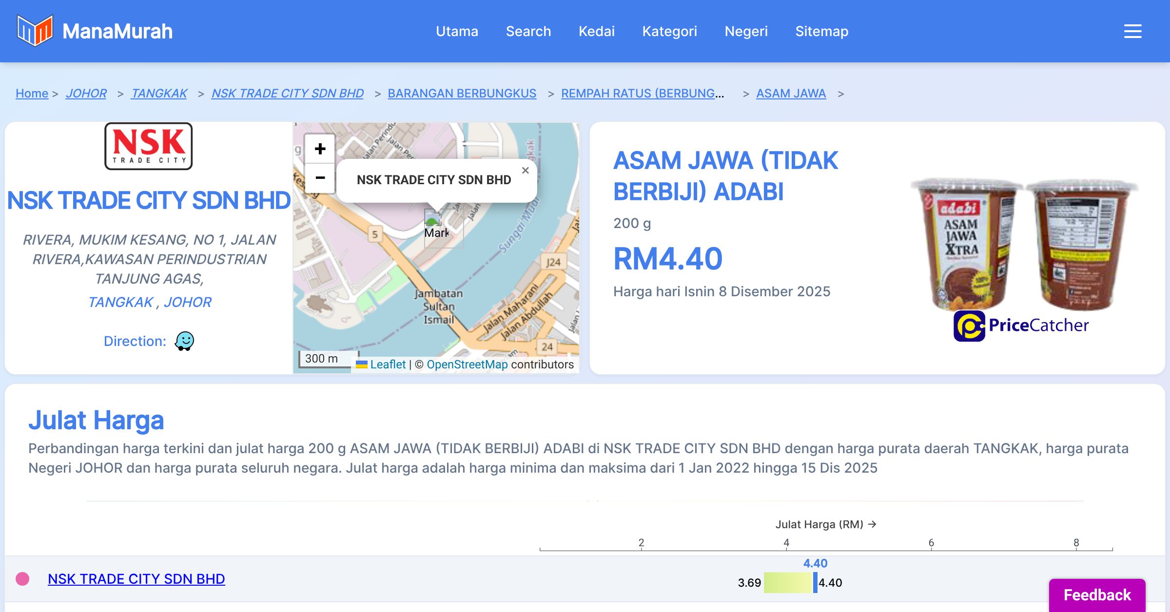 Perubahan harga purata mingguan 200 g ASAM JAWA (TIDAK BERBIJI) ADABI di NSK TRADE CITY SDN BHD berbanding harga purata mingguan daerah TANGKAK, harga purata mingguan negeri JOHOR dan harga purata mingguan seluruh negara sehingga 8 Dis 2025