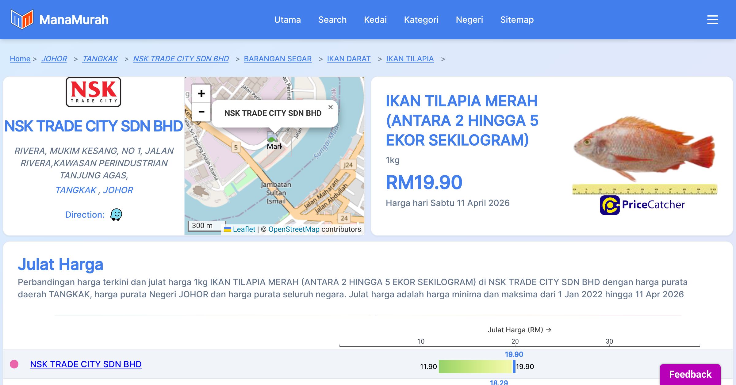 Perbandingan harga terkini dan julat harga 1kg IKAN TILAPIA MERAH (ANTARA 2 HINGGA 5 EKOR SEKILOGRAM) di NSK TRADE CITY SDN BHD dengan harga purata daerah TANGKAK, harga purata Negeri JOHOR dan harga purata seluruh negara. Julat harga adalah harga minima dan maksima dari 1 Jan 2022 hingga 11 Apr 2026