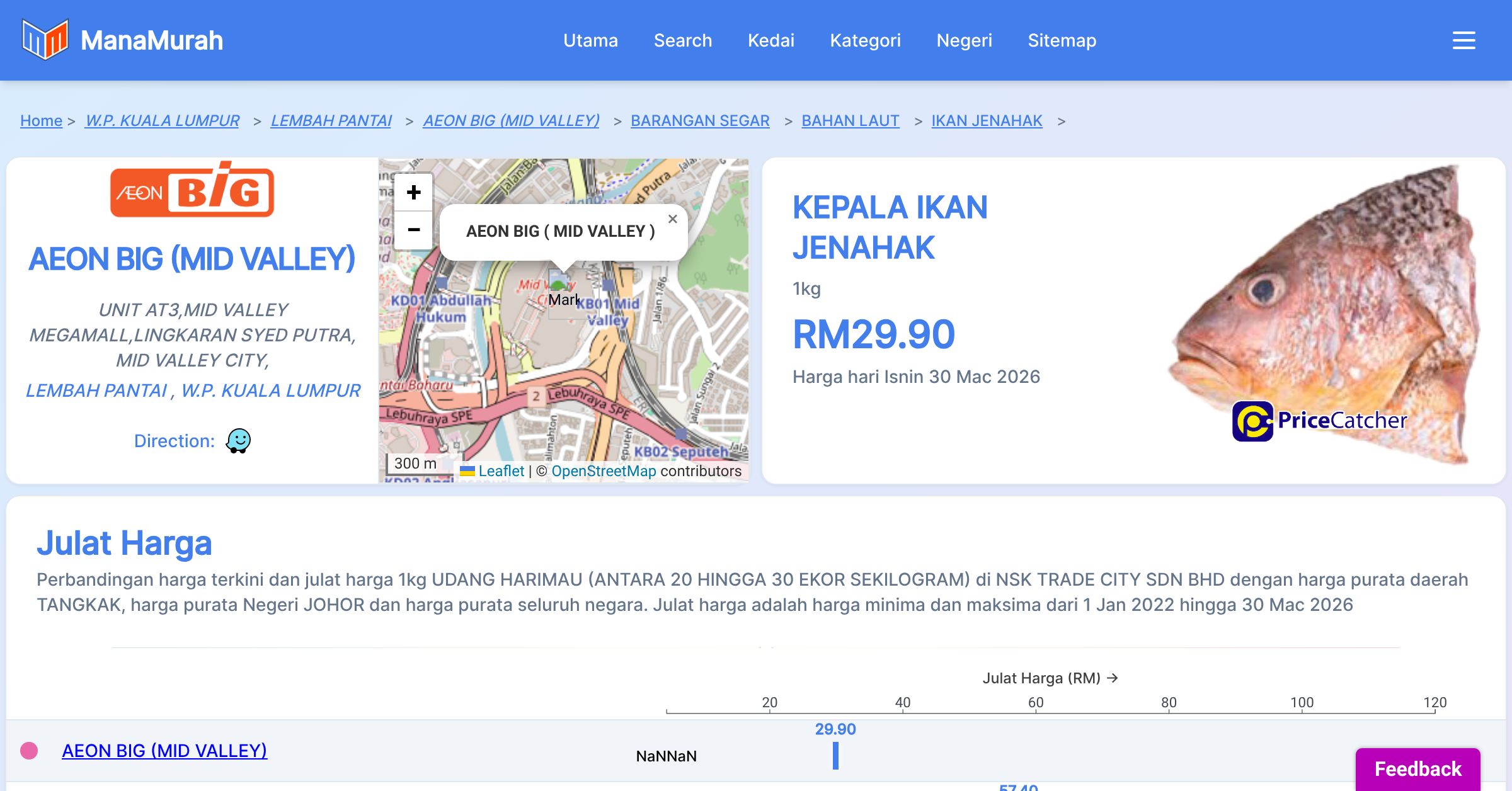 Tiada maklumat harga KEPALA IKAN JENAHAK di LEMBAH PANTAI pada minggu ke-14 tahun 2026 dari 30 Mac hingga 1 April