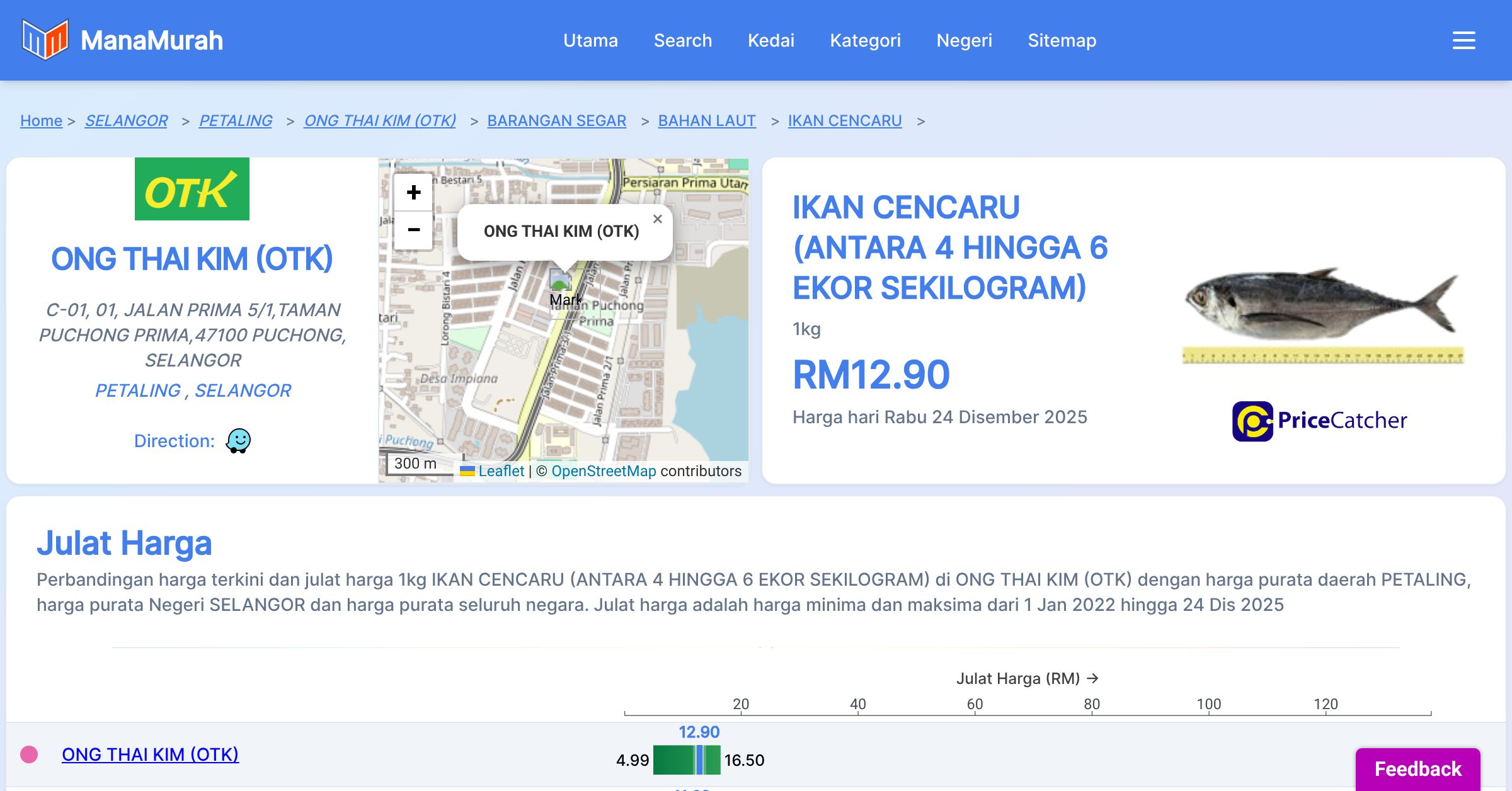 Perbandingan harga terkini dan julat harga 1kg IKAN CENCARU (ANTARA 4 HINGGA 6 EKOR SEKILOGRAM) di ONG THAI KIM (OTK) dengan harga purata daerah PETALING, harga purata Negeri SELANGOR dan harga purata seluruh negara. Julat harga adalah harga minima dan maksima dari 1 Jan 2022 hingga 24 Dis 2025