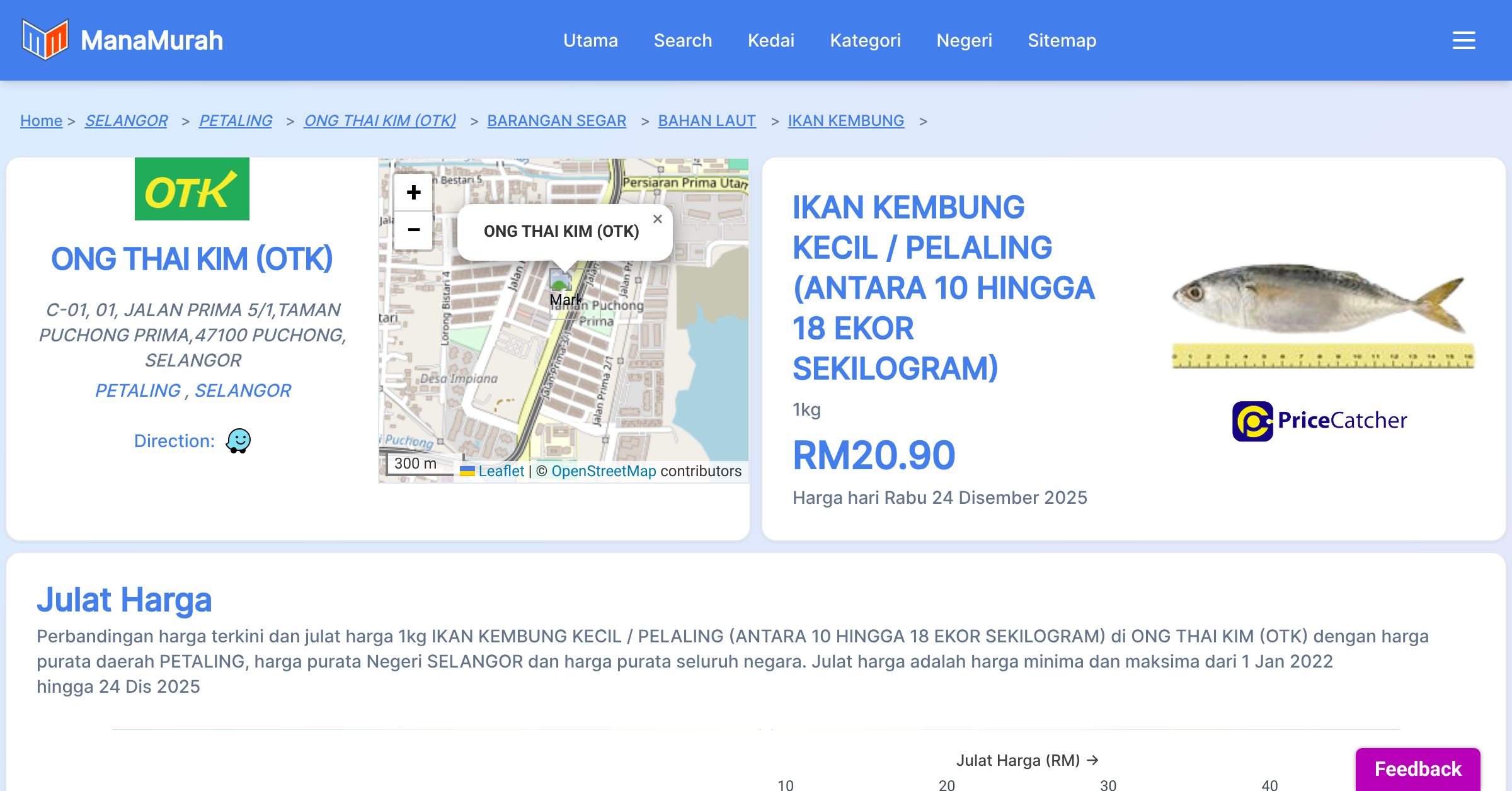 Perbandingan harga terkini dan julat harga 1kg IKAN KEMBUNG KECIL / PELALING (ANTARA 10 HINGGA 18 EKOR SEKILOGRAM) di ONG THAI KIM (OTK) dengan harga purata daerah PETALING, harga purata Negeri SELANGOR dan harga purata seluruh negara. Julat harga adalah harga minima dan maksima dari 1 Jan 2022 hingga 24 Dis 2025