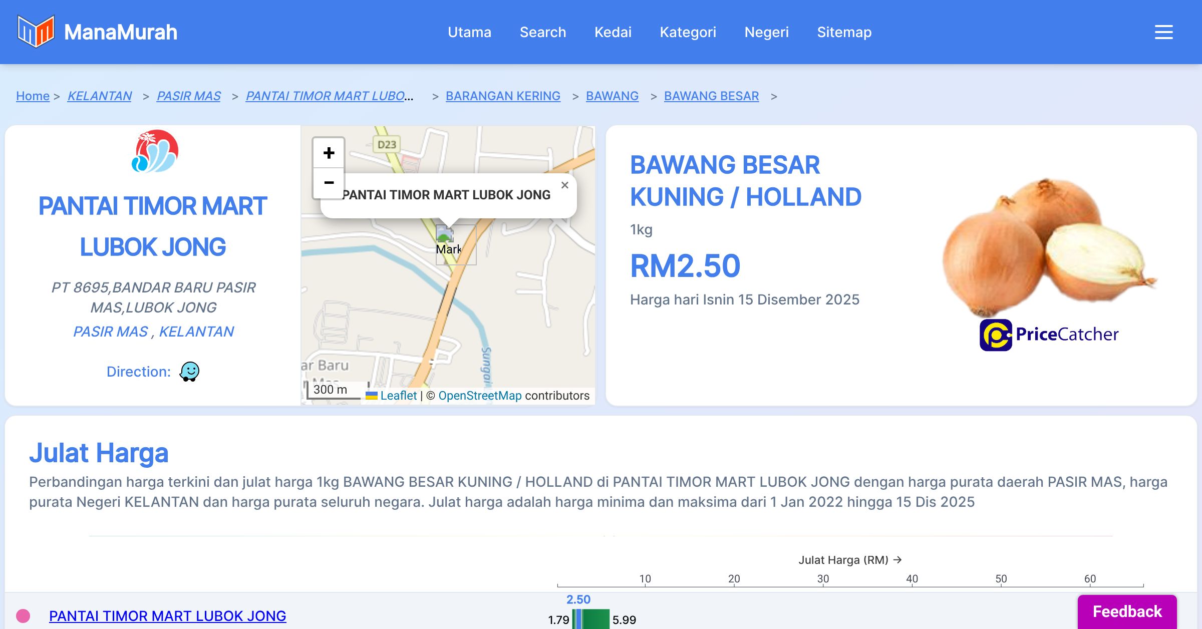 Perbandingan harga terkini dan julat harga 1kg BAWANG BESAR KUNING / HOLLAND di PANTAI TIMOR MART LUBOK JONG dengan harga purata daerah PASIR MAS, harga purata Negeri KELANTAN dan harga purata seluruh negara. Julat harga adalah harga minima dan maksima dari 1 Jan 2022 hingga 14 Dis 2025