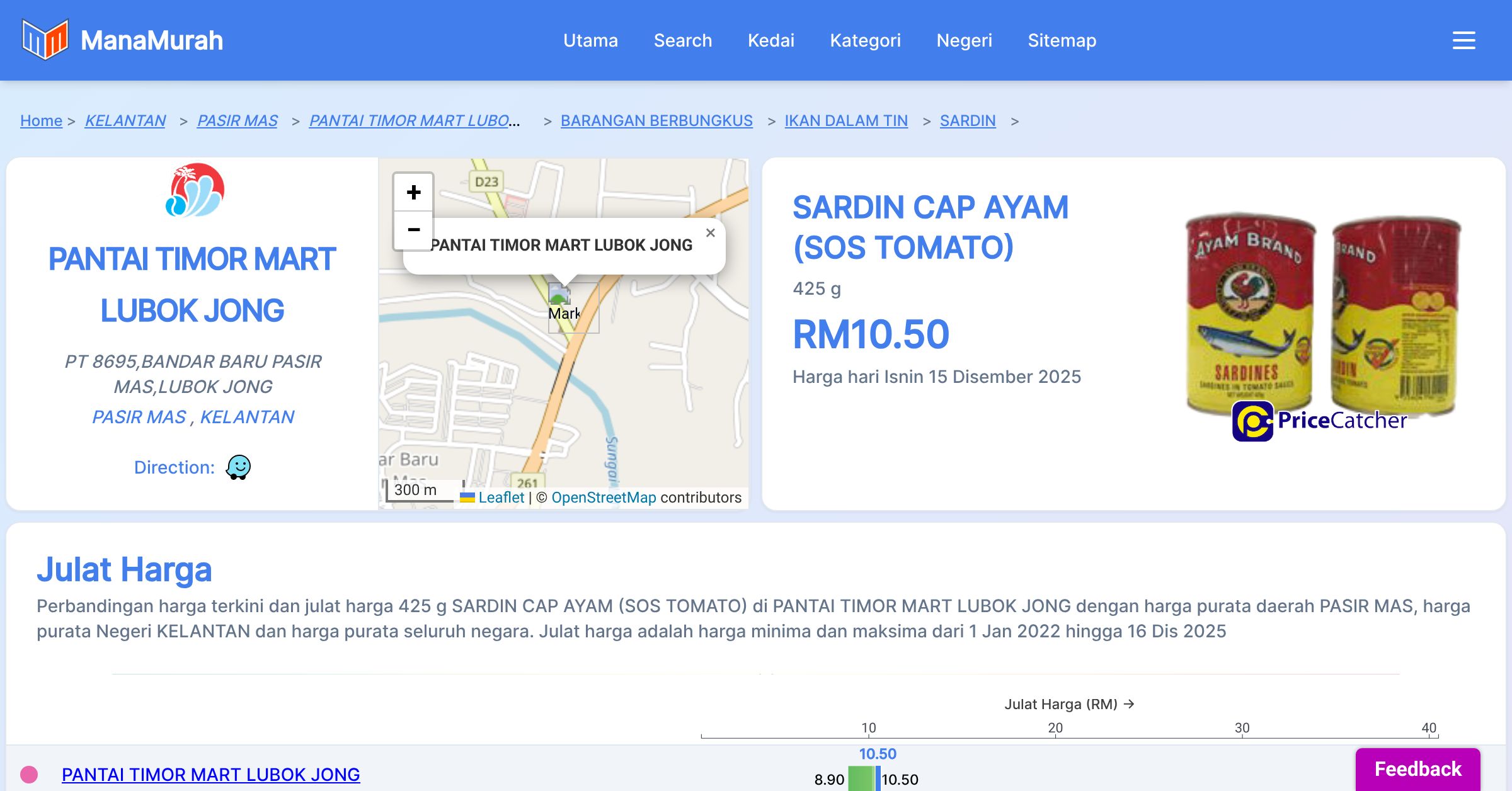 Perbandingan harga terkini dan julat harga 425 g SARDIN CAP AYAM (SOS TOMATO) di PANTAI TIMOR MART LUBOK JONG dengan harga purata daerah PASIR MAS, harga purata Negeri KELANTAN dan harga purata seluruh negara. Julat harga adalah harga minima dan maksima dari 1 Jan 2022 hingga 16 Dis 2025