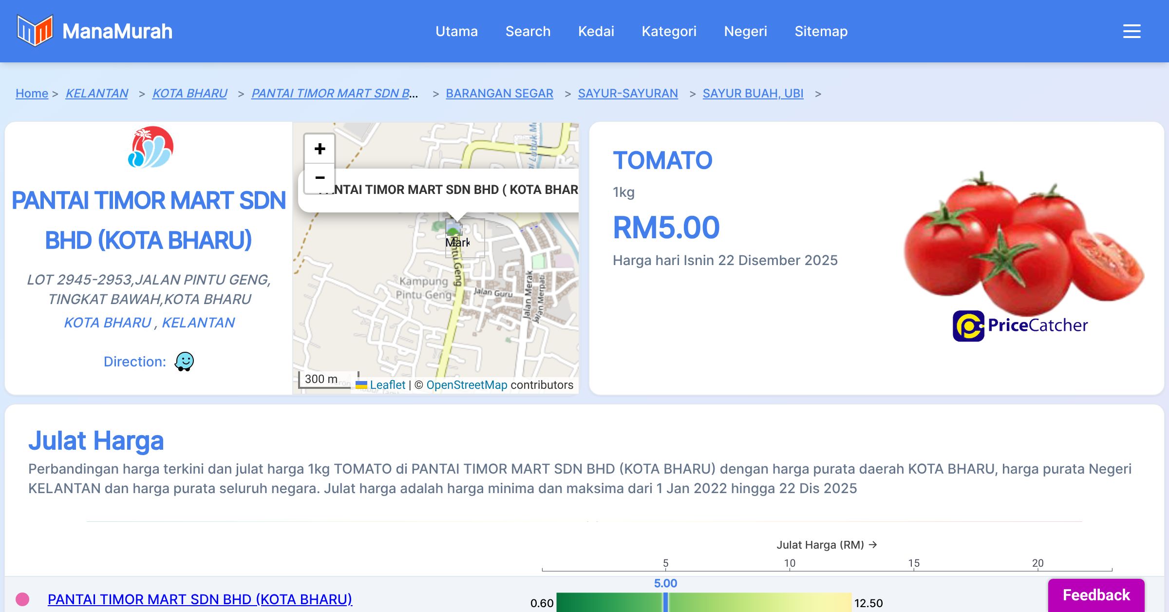 Perbandingan harga terkini dan julat harga 1kg TOMATO di PANTAI TIMOR MART SDN BHD (KOTA BHARU) dengan harga purata daerah KOTA BHARU, harga purata Negeri KELANTAN dan harga purata seluruh negara. Julat harga adalah harga minima dan maksima dari 1 Jan 2022 hingga 22 Dis 2025