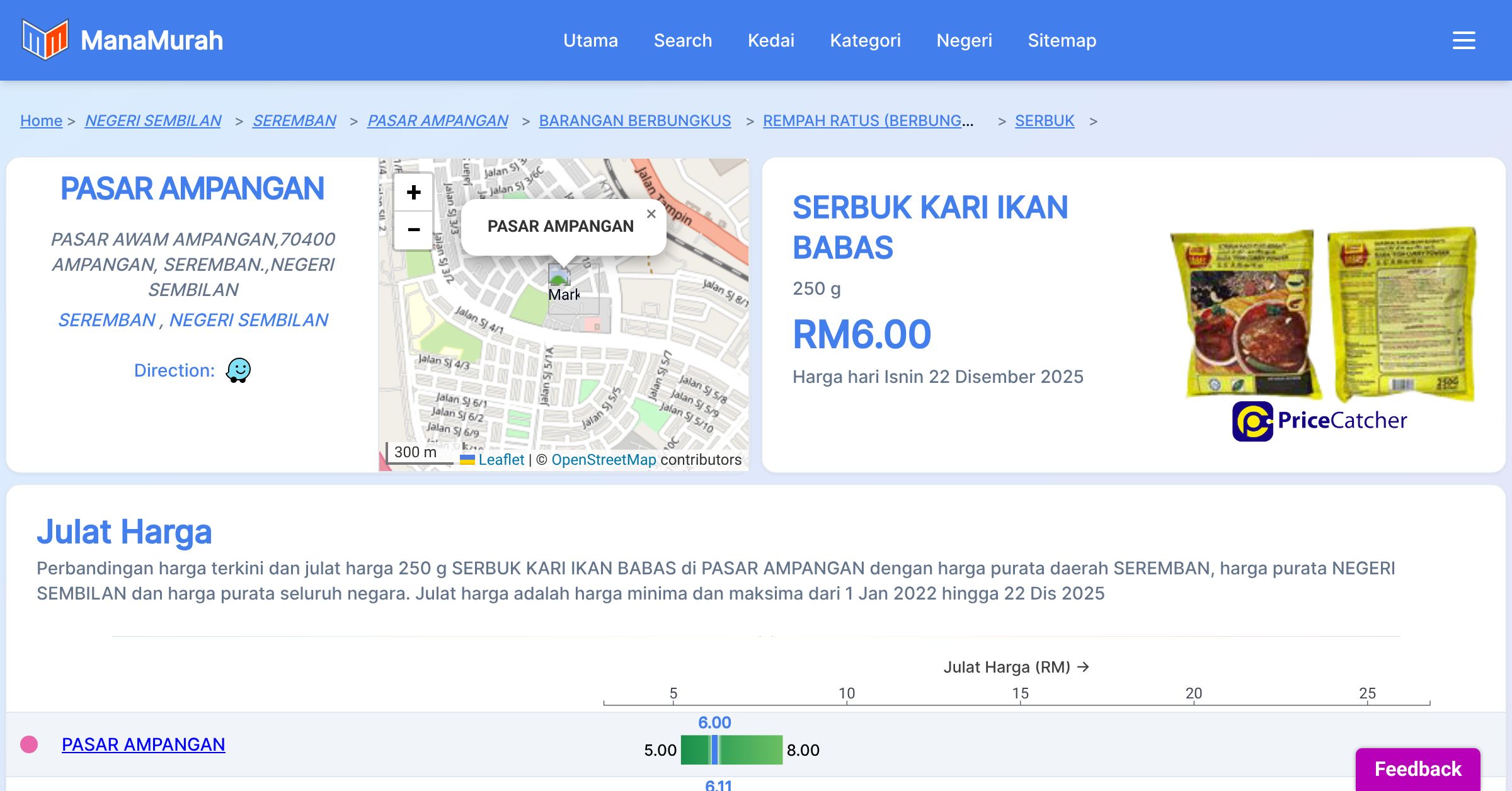 Perbandingan harga terkini dan julat harga 250 g SERBUK KARI IKAN BABAS di PASAR AMPANGAN dengan harga purata daerah SEREMBAN, harga purata NEGERI SEMBILAN dan harga purata seluruh negara. Julat harga adalah harga minima dan maksima dari 1 Jan 2022 hingga 22 Dis 2025