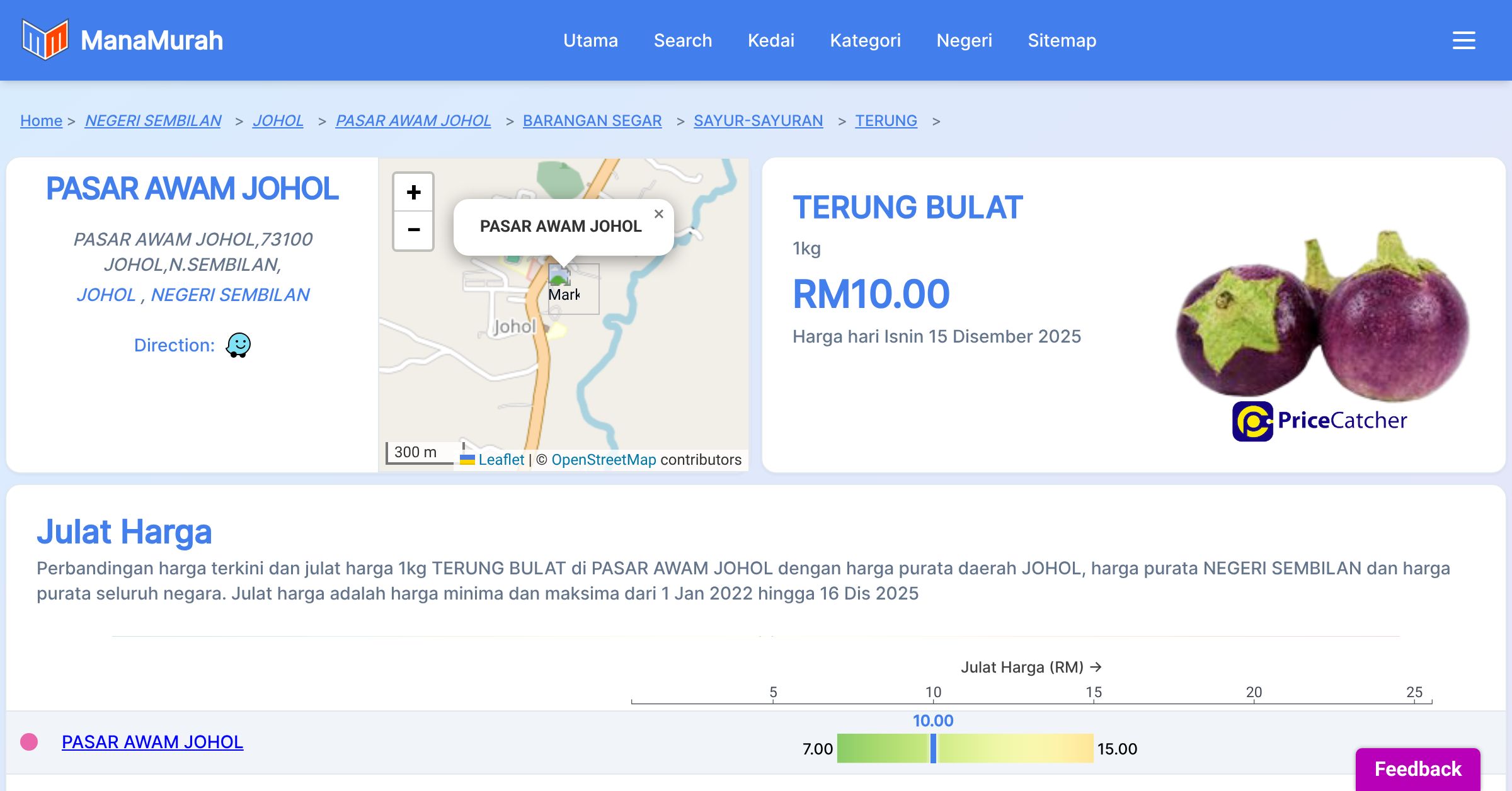 Perbandingan harga terkini dan julat harga 1kg TERUNG BULAT di PASAR AWAM JOHOL dengan harga purata daerah JOHOL, harga purata NEGERI SEMBILAN dan harga purata seluruh negara. Julat harga adalah harga minima dan maksima dari 1 Jan 2022 hingga 16 Dis 2025