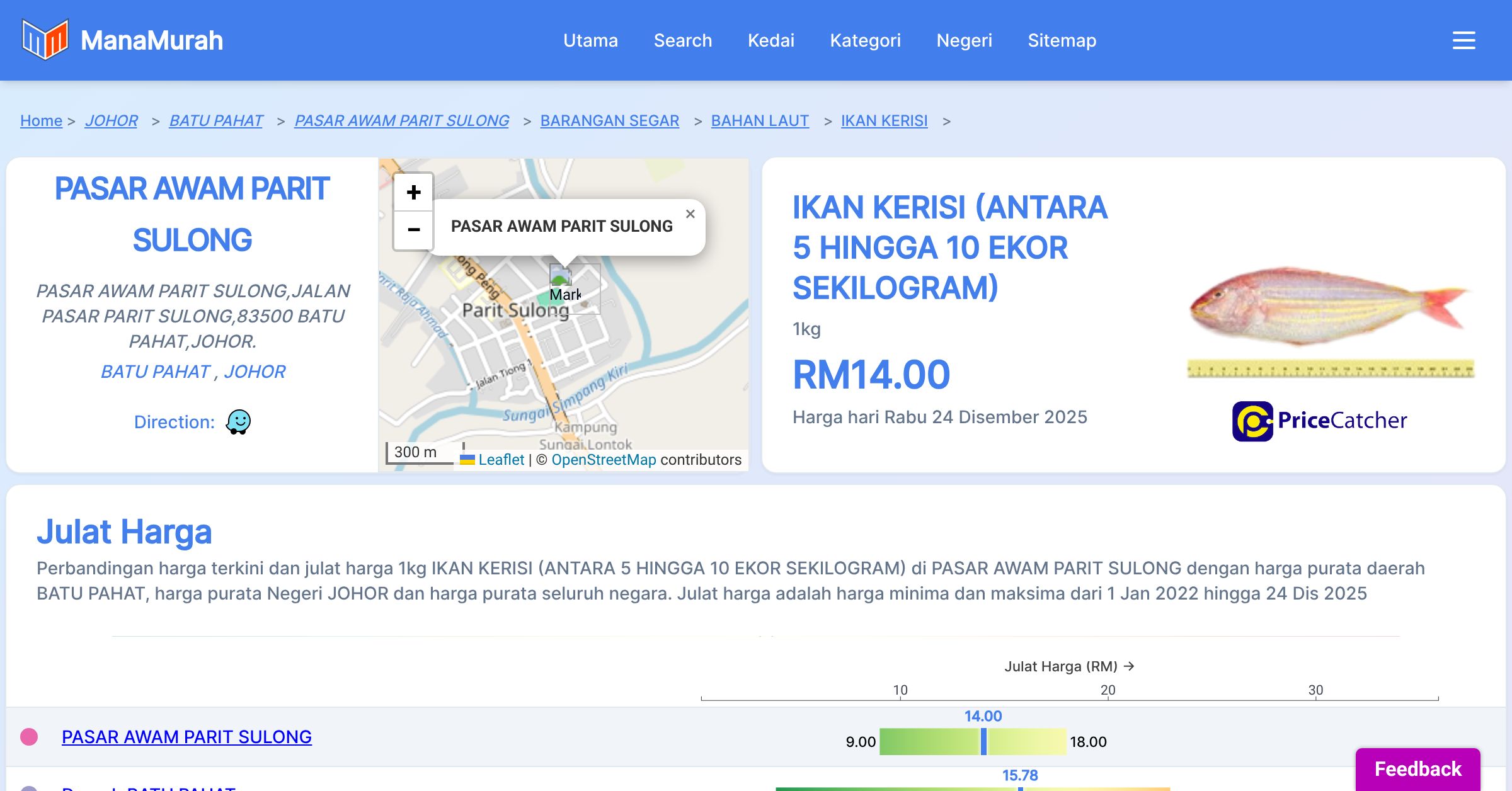 Perbandingan harga terkini dan julat harga 1kg IKAN KERISI (ANTARA 5 HINGGA 10 EKOR SEKILOGRAM) di PASAR AWAM PARIT SULONG dengan harga purata daerah BATU PAHAT, harga purata Negeri JOHOR dan harga purata seluruh negara. Julat harga adalah harga minima dan maksima dari 1 Jan 2022 hingga 24 Dis 2025