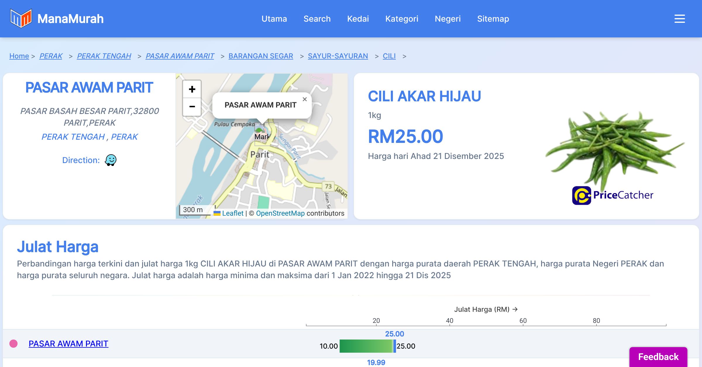 Perbandingan harga terkini dan julat harga 1kg CILI AKAR HIJAU di PASAR AWAM PARIT dengan harga purata daerah PERAK TENGAH, harga purata Negeri PERAK dan harga purata seluruh negara. Julat harga adalah harga minima dan maksima dari 1 Jan 2022 hingga 21 Dis 2025