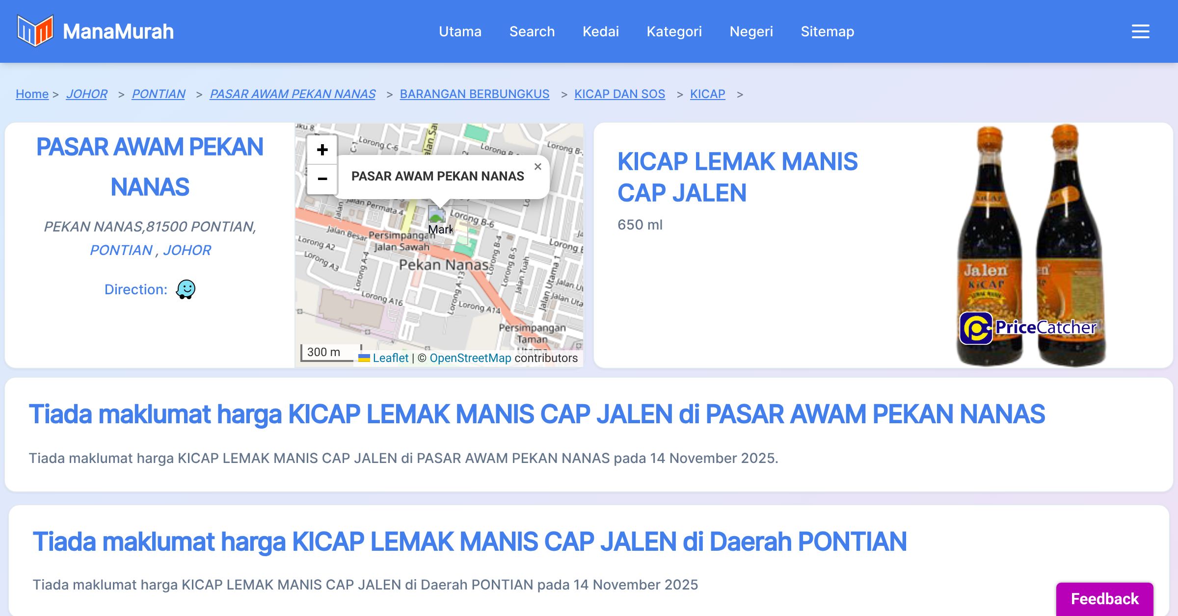Tiada maklumat harga KICAP LEMAK MANIS CAP JALEN di PASAR AWAM PEKAN NANAS pada 14 November 2025.