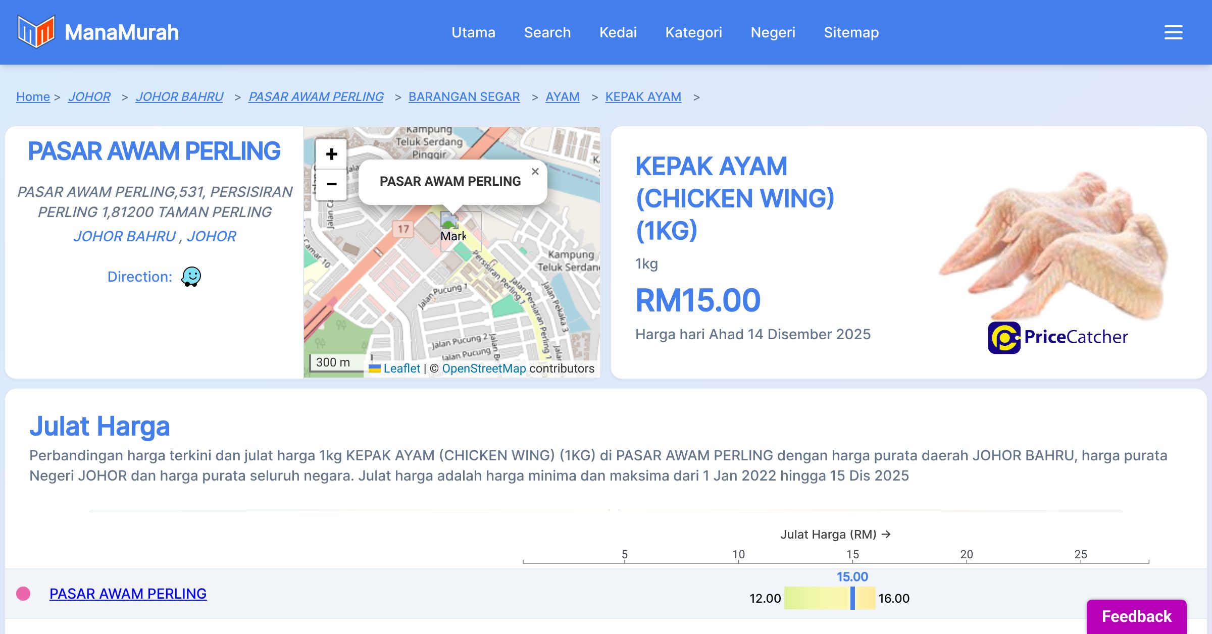 Perbandingan harga terkini dan julat harga 1kg KEPAK AYAM (CHICKEN WING) (1KG) di PASAR AWAM PERLING dengan harga purata daerah JOHOR BAHRU, harga purata Negeri JOHOR dan harga purata seluruh negara. Julat harga adalah harga minima dan maksima dari 1 Jan 2022 hingga 15 Dis 2025
