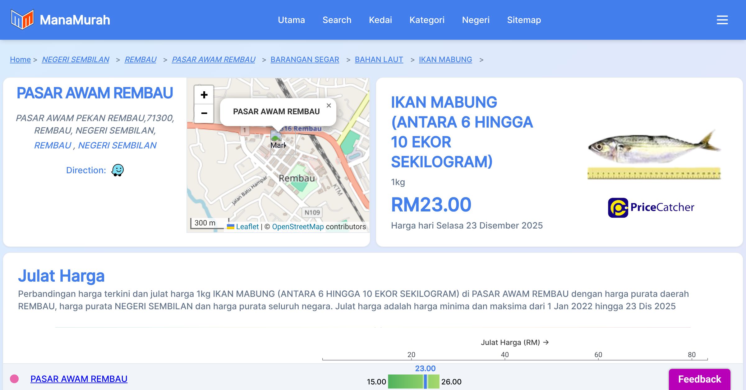 Perbandingan harga terkini dan julat harga 1kg IKAN MABUNG (ANTARA 6 HINGGA 10 EKOR SEKILOGRAM) di PASAR AWAM REMBAU dengan harga purata daerah REMBAU, harga purata NEGERI SEMBILAN dan harga purata seluruh negara. Julat harga adalah harga minima dan maksima dari 1 Jan 2022 hingga 23 Dis 2025