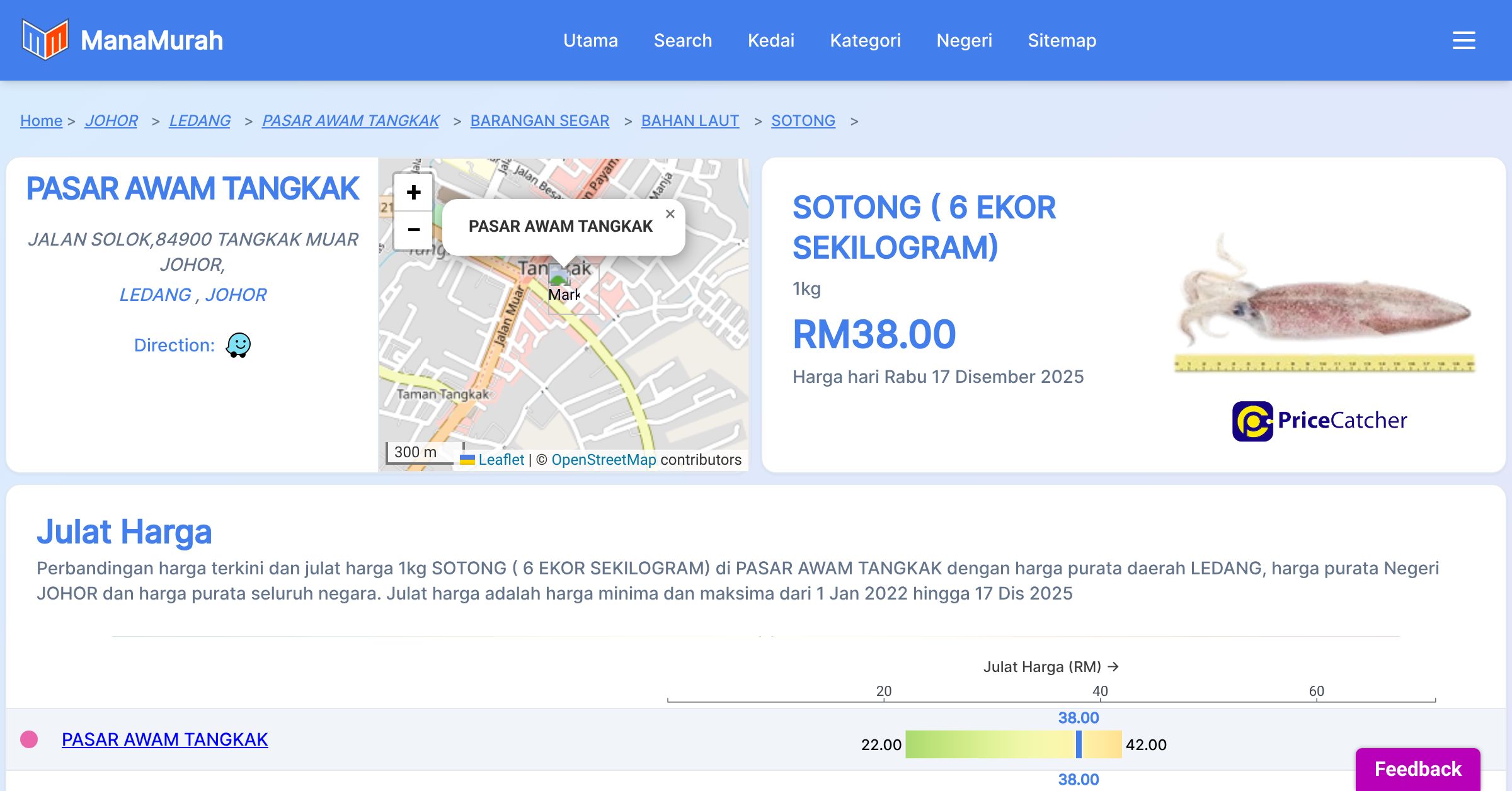 Perbandingan harga terkini dan julat harga 1kg SOTONG ( 6 EKOR SEKILOGRAM) di PASAR AWAM TANGKAK dengan harga purata daerah LEDANG, harga purata Negeri JOHOR dan harga purata seluruh negara. Julat harga adalah harga minima dan maksima dari 1 Jan 2022 hingga 17 Dis 2025