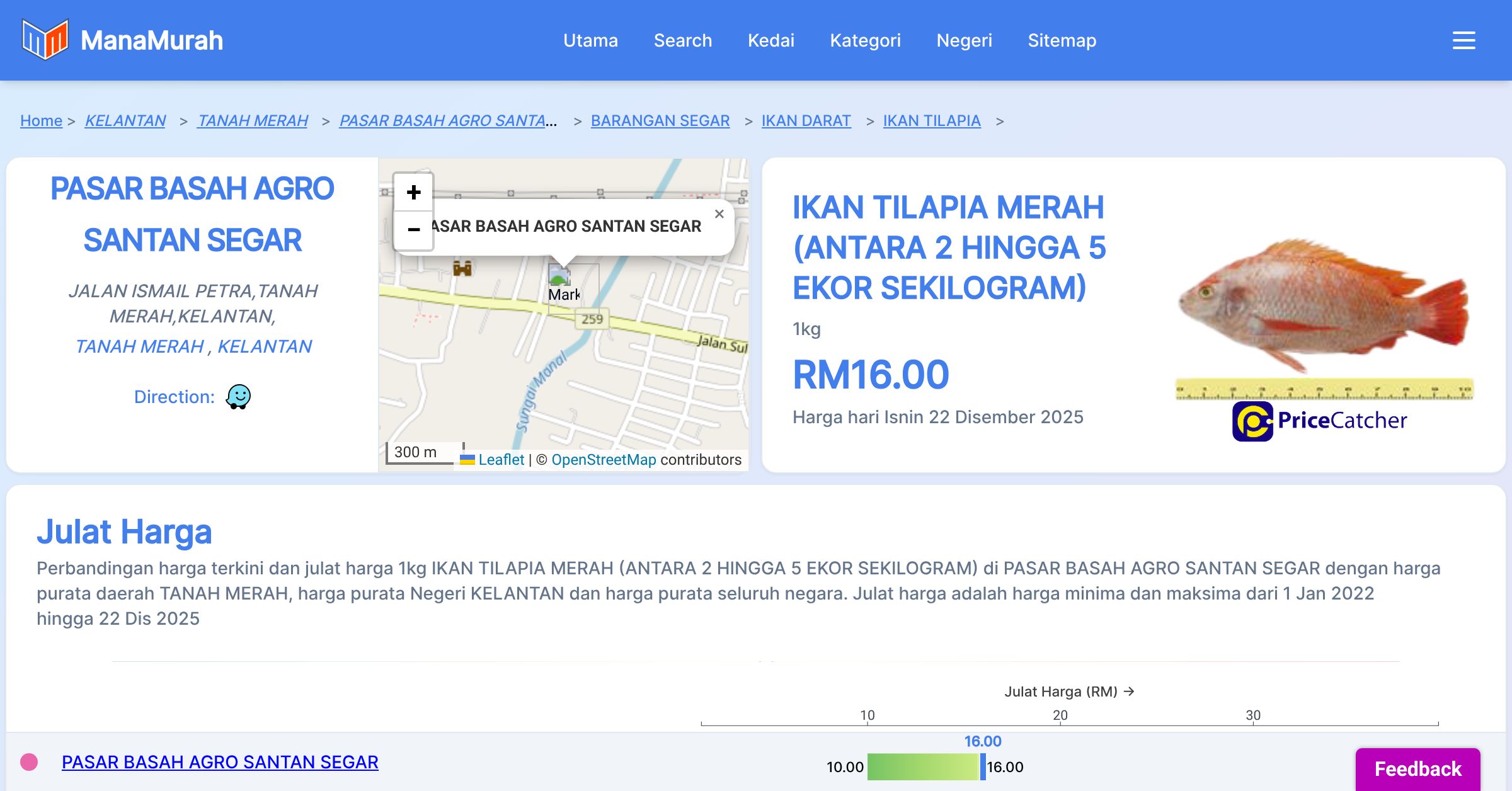 Perbandingan harga terkini dan julat harga 1kg IKAN TILAPIA MERAH (ANTARA 2 HINGGA 5 EKOR SEKILOGRAM) di PASAR BASAH AGRO SANTAN SEGAR dengan harga purata daerah TANAH MERAH, harga purata Negeri KELANTAN dan harga purata seluruh negara. Julat harga adalah harga minima dan maksima dari 1 Jan 2022 hingga 22 Dis 2025