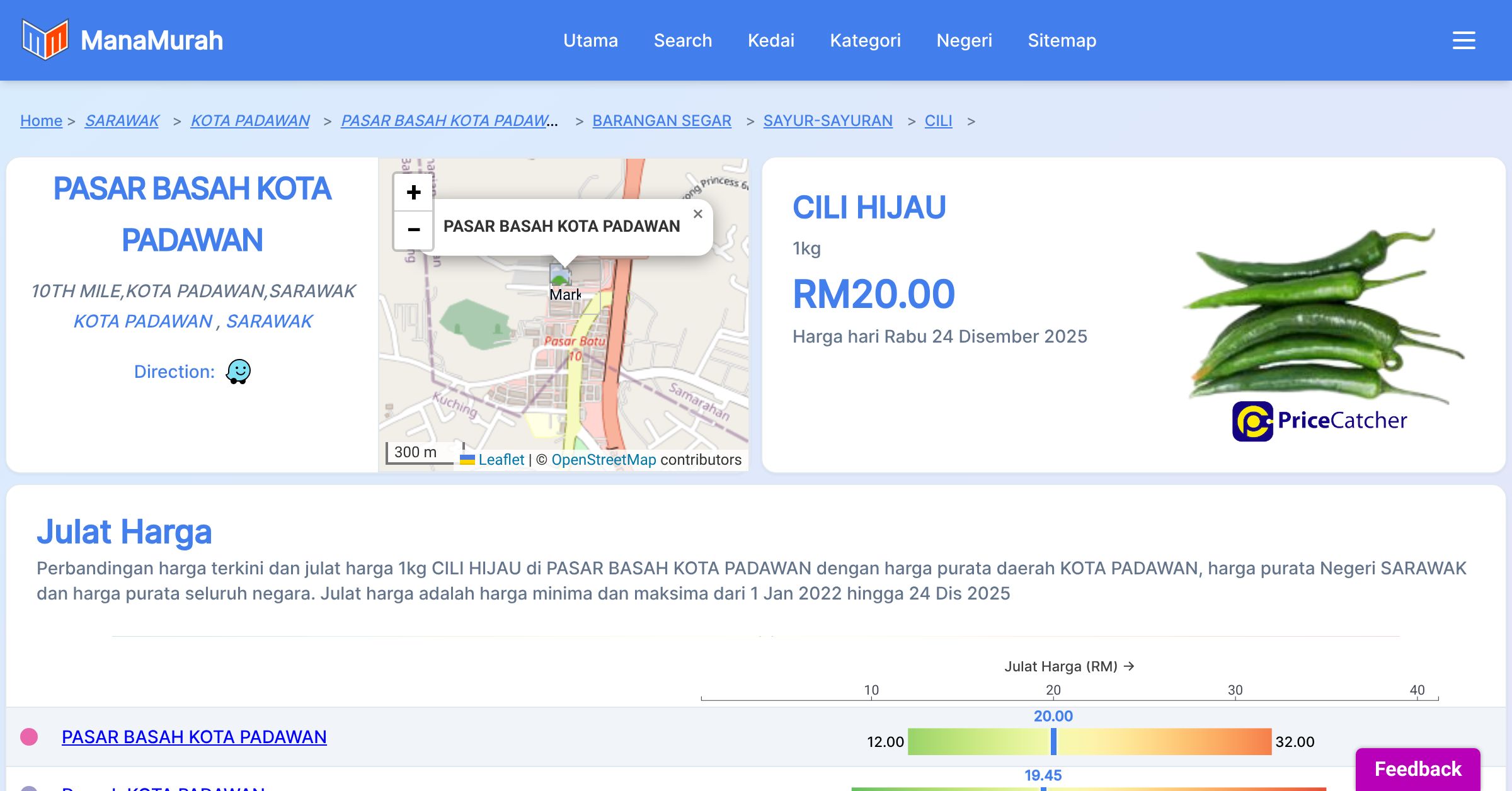 Perbandingan harga terkini dan julat harga 1kg CILI HIJAU di PASAR BASAH KOTA PADAWAN dengan harga purata daerah KOTA PADAWAN, harga purata Negeri SARAWAK dan harga purata seluruh negara. Julat harga adalah harga minima dan maksima dari 1 Jan 2022 hingga 24 Dis 2025