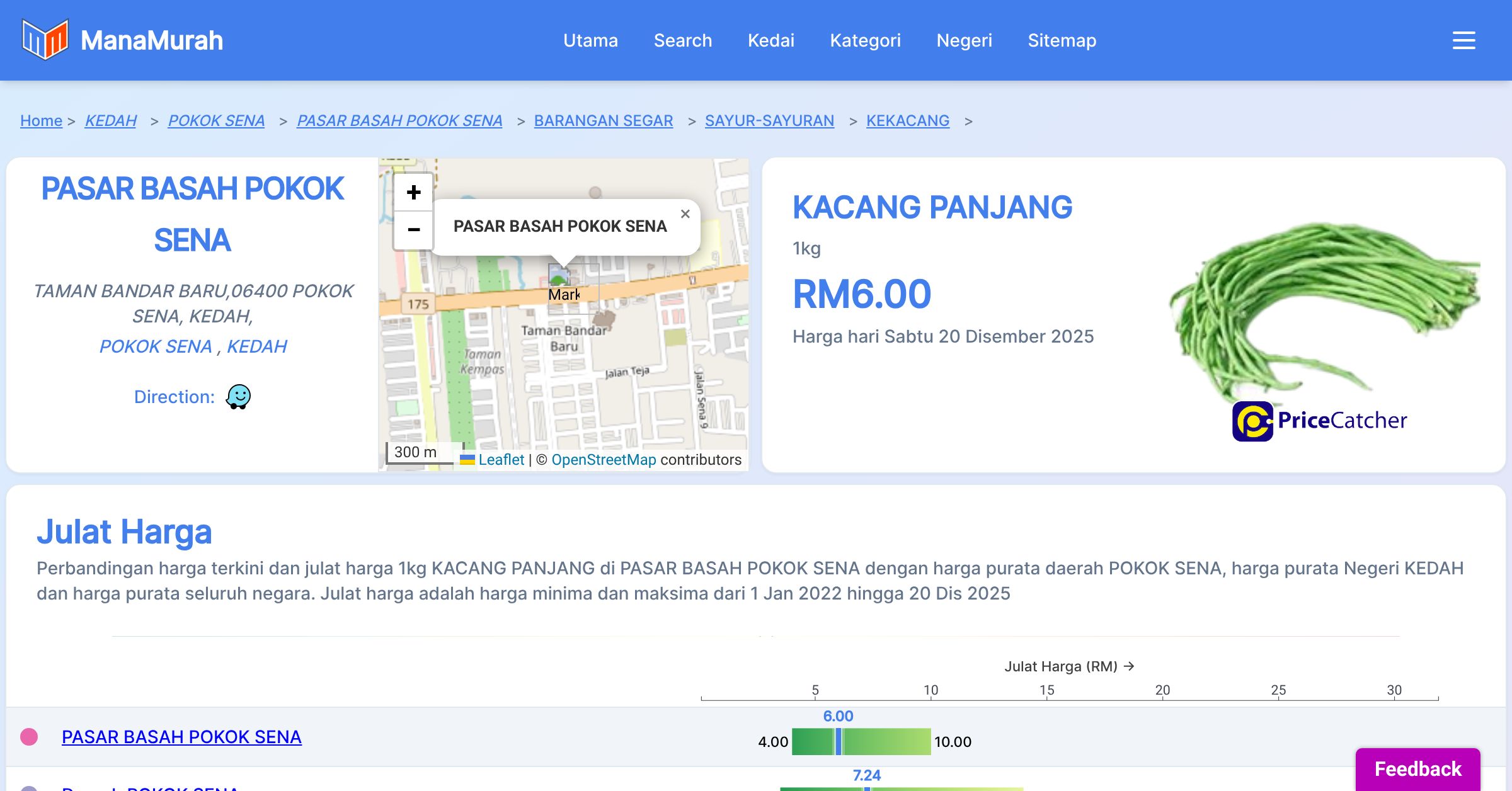 Perbandingan harga terkini dan julat harga 1kg KACANG PANJANG di PASAR BASAH POKOK SENA dengan harga purata daerah POKOK SENA, harga purata Negeri KEDAH dan harga purata seluruh negara. Julat harga adalah harga minima dan maksima dari 1 Jan 2022 hingga 20 Dis 2025