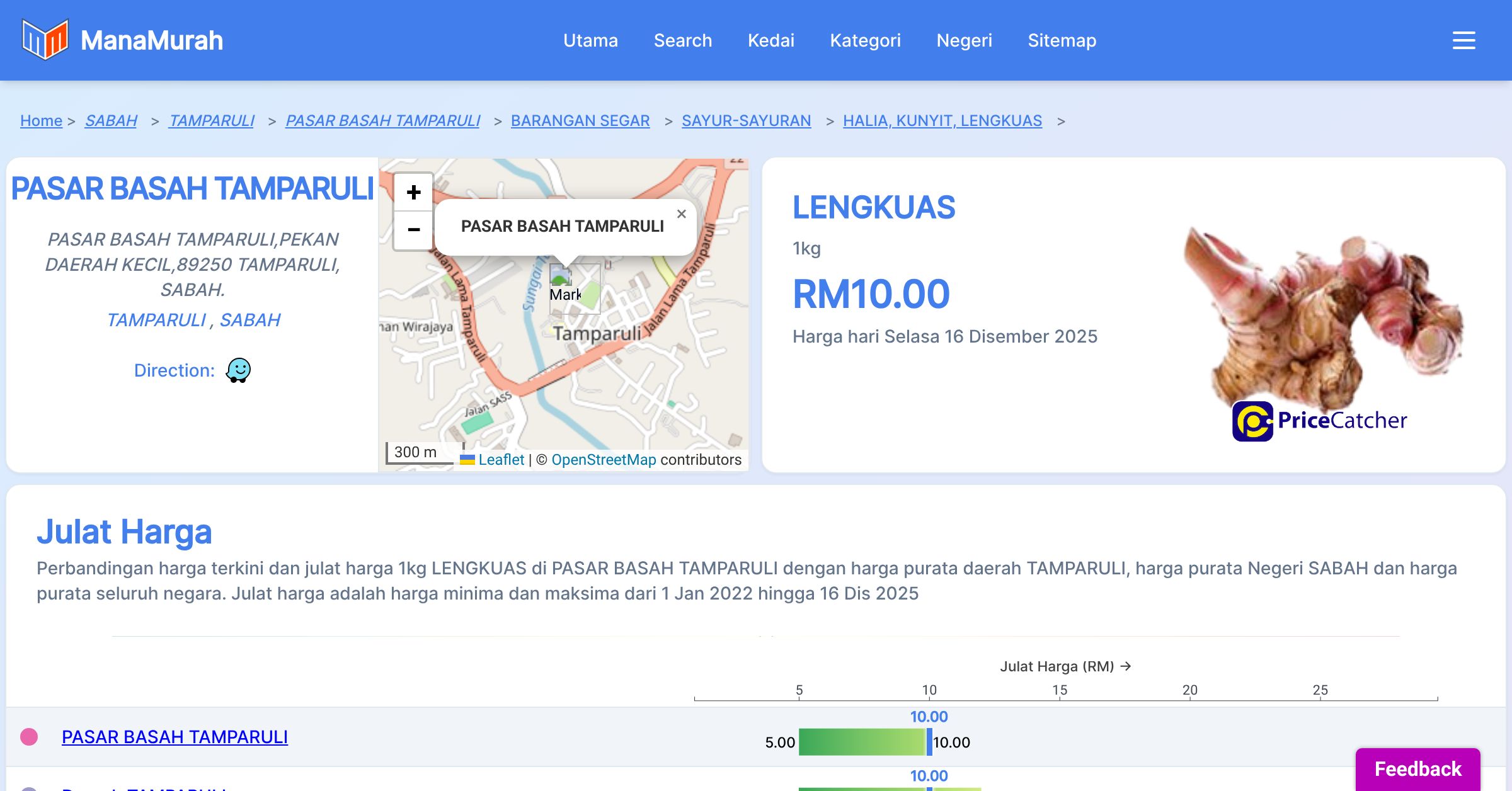 Perbandingan harga terkini dan julat harga 1kg LENGKUAS di PASAR BASAH TAMPARULI dengan harga purata daerah TAMPARULI, harga purata Negeri SABAH dan harga purata seluruh negara. Julat harga adalah harga minima dan maksima dari 1 Jan 2022 hingga 16 Dis 2025